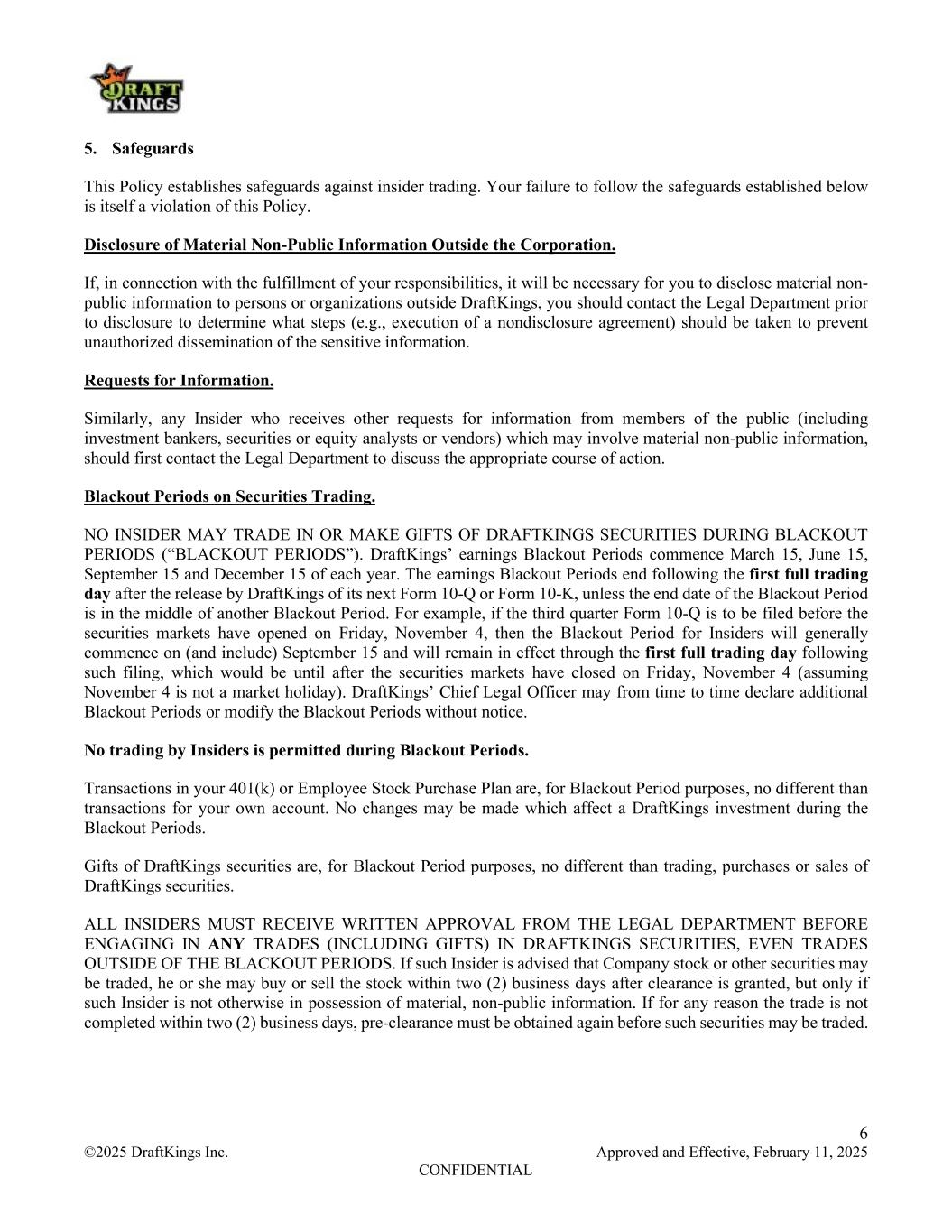 6 ©2025 DraftKings Inc. Approved and Effective, February 11, 2025 CONFIDENTIAL 5. Safeguards This Policy establishes safeguards against insider trading. Your failure to follow the safeguards established below is itself a violation of this Policy. Disclosure of Material Non-Public Information Outside the Corporation. If, in connection with the fulfillment of your responsibilities, it will be necessary for you to disclose material non- public information to persons or organizations outside DraftKings, you should contact the Legal Department prior to disclosure to determine what steps (e.g., execution of a nondisclosure agreement) should be taken to prevent unauthorized dissemination of the sensitive information. Requests for Information. Similarly, any Insider who receives other requests for information from members of the public (including investment bankers, securities or equity analysts or vendors) which may involve material non-public information, should first contact the Legal Department to discuss the appropriate course of action. Blackout Periods on Securities Trading. NO INSIDER MAY TRADE IN OR MAKE GIFTS OF DRAFTKINGS SECURITIES DURING BLACKOUT PERIODS (“BLACKOUT PERIODS”). DraftKings’ earnings Blackout Periods commence March 15, June 15, September 15 and December 15 of each year. The earnings Blackout Periods end following the first full trading day after the release by DraftKings of its next Form 10-Q or Form 10-K, unless the end date of the Blackout Period is in the middle of another Blackout Period. For example, if the third quarter Form 10-Q is to be filed before the securities markets have opened on Friday, November 4, then the Blackout Period for Insiders will generally commence on (and include) September 15 and will remain in effect through the first full trading day following such filing, which would be until after the securities markets have closed on Friday, November 4 (assuming November 4 is not a market holiday). DraftKings’ Chief Legal Officer may from time to time declare additional Blackout Periods or modify the Blackout Periods without notice. No trading by Insiders is permitted during Blackout Periods. Transactions in your 401(k) or Employee Stock Purchase Plan are, for Blackout Period purposes, no different than transactions for your own account. No changes may be made which affect a DraftKings investment during the Blackout Periods. Gifts of DraftKings securities are, for Blackout Period purposes, no different than trading, purchases or sales of DraftKings securities. ALL INSIDERS MUST RECEIVE WRITTEN APPROVAL FROM THE LEGAL DEPARTMENT BEFORE ENGAGING IN ANY TRADES (INCLUDING GIFTS) IN DRAFTKINGS SECURITIES, EVEN TRADES OUTSIDE OF THE BLACKOUT PERIODS. If such Insider is advised that Company stock or other securities may be traded, he or she may buy or sell the stock within two (2) business days after clearance is granted, but only if such Insider is not otherwise in possession of material, non-public information. If for any reason the trade is not completed within two (2) business days, pre-clearance must be obtained again before such securities may be traded.