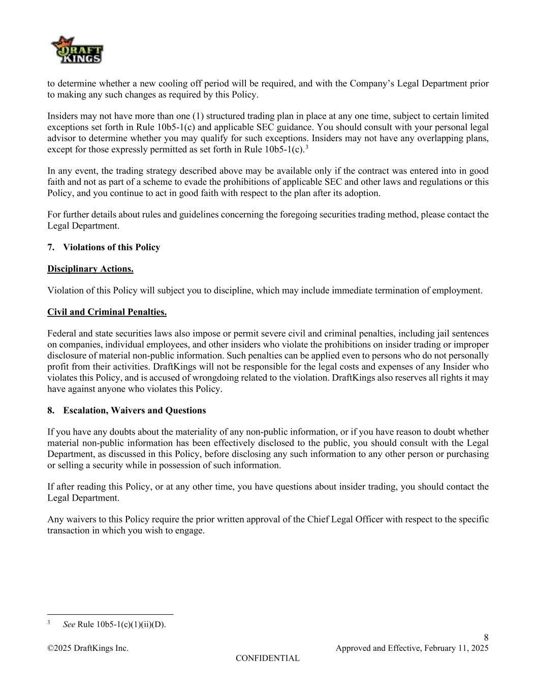 8 ©2025 DraftKings Inc. Approved and Effective, February 11, 2025 CONFIDENTIAL to determine whether a new cooling off period will be required, and with the Company’s Legal Department prior to making any such changes as required by this Policy. Insiders may not have more than one (1) structured trading plan in place at any one time, subject to certain limited exceptions set forth in Rule 10b5-1(c) and applicable SEC guidance. You should consult with your personal legal advisor to determine whether you may qualify for such exceptions. Insiders may not have any overlapping plans, except for those expressly permitted as set forth in Rule 10b5-1(c).3 In any event, the trading strategy described above may be available only if the contract was entered into in good faith and not as part of a scheme to evade the prohibitions of applicable SEC and other laws and regulations or this Policy, and you continue to act in good faith with respect to the plan after its adoption. For further details about rules and guidelines concerning the foregoing securities trading method, please contact the Legal Department. 7. Violations of this Policy Disciplinary Actions. Violation of this Policy will subject you to discipline, which may include immediate termination of employment. Civil and Criminal Penalties. Federal and state securities laws also impose or permit severe civil and criminal penalties, including jail sentences on companies, individual employees, and other insiders who violate the prohibitions on insider trading or improper disclosure of material non-public information. Such penalties can be applied even to persons who do not personally profit from their activities. DraftKings will not be responsible for the legal costs and expenses of any Insider who violates this Policy, and is accused of wrongdoing related to the violation. DraftKings also reserves all rights it may have against anyone who violates this Policy. 8. Escalation, Waivers and Questions If you have any doubts about the materiality of any non-public information, or if you have reason to doubt whether material non-public information has been effectively disclosed to the public, you should consult with the Legal Department, as discussed in this Policy, before disclosing any such information to any other person or purchasing or selling a security while in possession of such information. If after reading this Policy, or at any other time, you have questions about insider trading, you should contact the Legal Department. Any waivers to this Policy require the prior written approval of the Chief Legal Officer with respect to the specific transaction in which you wish to engage. 3 See Rule 10b5-1(c)(1)(ii)(D).