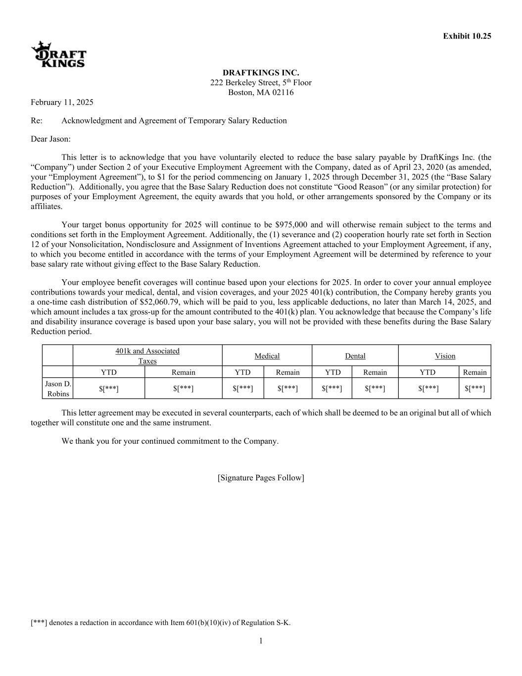 Exhibit 10.25 DRAFTKINGS INC. 222 Berkeley Street, 5th Floor Boston, MA 02116 [***] denotes a redaction in accordance with Item 601(b)(10)(iv) of Regulation S-K. 1 February 11, 2025 Re: Acknowledgment and Agreement of Temporary Salary Reduction Dear Jason: This letter is to acknowledge that you have voluntarily elected to reduce the base salary payable by DraftKings Inc. (the “Company”) under Section 2 of your Executive Employment Agreement with the Company, dated as of April 23, 2020 (as amended, your “Employment Agreement”), to $1 for the period commencing on January 1, 2025 through December 31, 2025 (the “Base Salary Reduction”). Additionally, you agree that the Base Salary Reduction does not constitute “Good Reason” (or any similar protection) for purposes of your Employment Agreement, the equity awards that you hold, or other arrangements sponsored by the Company or its affiliates. Your target bonus opportunity for 2025 will continue to be $975,000 and will otherwise remain subject to the terms and conditions set forth in the Employment Agreement. Additionally, the (1) severance and (2) cooperation hourly rate set forth in Section 12 of your Nonsolicitation, Nondisclosure and Assignment of Inventions Agreement attached to your Employment Agreement, if any, to which you become entitled in accordance with the terms of your Employment Agreement will be determined by reference to your base salary rate without giving effect to the Base Salary Reduction. Your employee benefit coverages will continue based upon your elections for 2025. In order to cover your annual employee contributions towards your medical, dental, and vision coverages, and your 2025 401(k) contribution, the Company hereby grants you a one-time cash distribution of $52,060.79, which will be paid to you, less applicable deductions, no later than March 14, 2025, and which amount includes a tax gross-up for the amount contributed to the 401(k) plan. You acknowledge that because the Company’s life and disability insurance coverage is based upon your base salary, you will not be provided with these benefits during the Base Salary Reduction period. 401k and Associated Taxes Medical Dental Vision YTD Remain YTD Remain YTD Remain YTD Remain Jason D. Robins $[***] $[***] $[***] $[***] $[***] $[***] $[***] $[***] This letter agreement may be executed in several counterparts, each of which shall be deemed to be an original but all of which together will constitute one and the same instrument. We thank you for your continued commitment to the Company. [Signature Pages Follow]