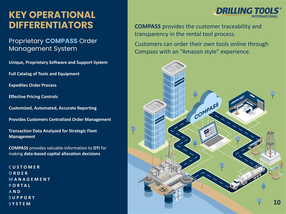 KEY OPERATIONAL DIFFERENTIATORS COMPASS provides the customer traceability and transparency in the rental tool process. Proprietary COMPASS Order Customers can order their own tools online through Management System Compass with an “Amazon style” experience. Unique, Proprietary Software and Support System Full Catalog of Tools and Equipment Expedites Order Process Effective Pricing Controls Customized, Automated, Accurate Reporting Provides Customers Centralized Order Management Transaction Data Analyzed for Strategic Fleet Management COMPASS provides valuable information to DTI for making data-based capital allocation decisions C U S T O M E R O R D E R M A N A G E M E N T P O R T A L A N D S U P P O R T 10 S Y S T E M