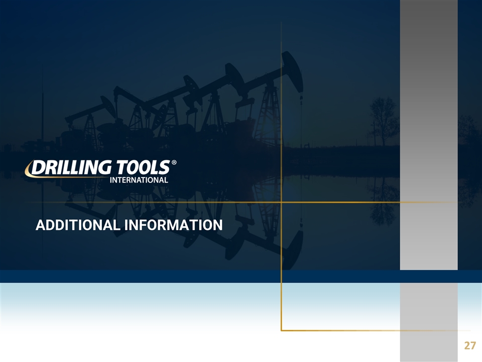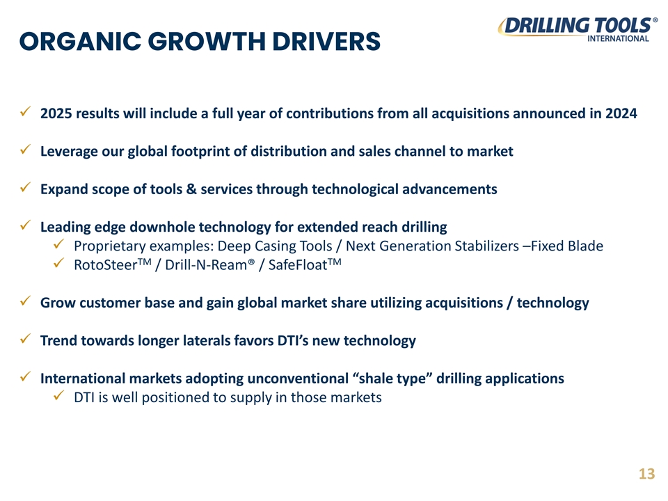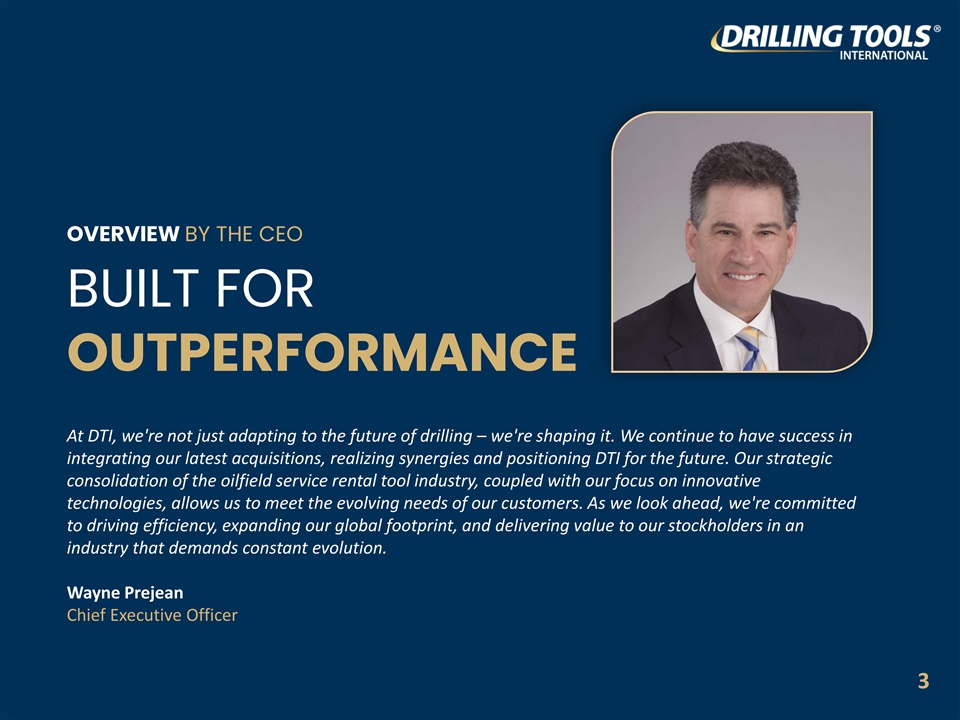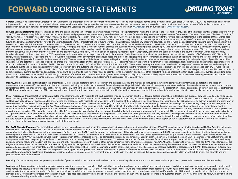 FORWARD LOOKING STATEMENTS General: Drilling Tools International Corporation (“DTI”) is making this presentation available in connection with the release of its financial results for the three months and full year ended December 31, 2024. The information contained in this presentation does not purport to be all-inclusive or to contain all information that prospective investors may require. Prospective investors are encouraged to conduct their own analysis and review of information contained in this presentation as well as important additional information through the Securities and Exchange Commission’s (“SEC”) EDGAR system at www.sec.gov and on our website at www.drillingtools.com. Forward-Looking Statements: This presentation and the oral statements made in connection herewith include “forward-looking statements” within the meaning of the “safe harbor” provisions of the Private Securities Litigation Reform Act of 1995. DTI’s actual results may differ from its expectations, estimates and projections, and, consequently, you should not rely on these forward-looking statements as predictions of future events. The words “anticipate,” “believe,” “continue,” “could,” “estimate,” “expect,” “intends,” “may,” “might,” “plan,” “possible,” “potential,” “predict,” “project,” “should,” “will,” “would” and similar expressions may identify forward-looking statements, but the absence of these words does not mean that a statement is not forward looking. These forward-looking statements include, but are not limited to, statements regarding DTI and its management team’s expectations, hopes, beliefs, intentions or strategies regarding the future. In addition, any statements that refer to projections, forecasts or other characterizations of future events or circumstances, including any underlying assumptions, are forward-looking statements. Forward-looking statements in this presentation may include, for example, statements about: (1) the demand for DTI’s products and services, which is influenced by the general level activity in the oil and gas industry; (2) DTI’s ability to retain its customers, particularly those that contribute to a large portion of its revenue; (3) DTI’s ability to employ and retain a sufficient number of skilled and qualified workers, including its key personnel; (4) DTI’s ability to market its services in a competitive industry; (5) DTI’s ability to execute, integrate and realize the benefits of acquisitions, and manage the resulting growth of its business; (6) potential liability for claims arising from damage or harm caused by the operation of DTI’s tools, or otherwise arising from the dangerous activities that are inherent in the oil and gas industry; (7) DTI’s ability to obtain additional capital; (8) potential political, regulatory, economic and social disruptions in the countries in which DTI conducts business, including changes in tax laws or tax rates; (9) DTI’s dependence on its information technology systems, in particular Customer Order Management Portal and Support System, for the efficient operation of DTI’s business; (10) DTI’s ability to comply with applicable laws, regulations and rules, including those related to the environment, greenhouse gases and climate change; (11) DTI’s ability to maintain an effective system of disclosure controls and internal control over financial reporting; (12) the potential for volatility in the market price of DTI’s common stock; (13) the impact of increased legal, accounting, administrative and other costs incurred as a public company, including the impact of possible shareholder litigation; (14) the potential for issuance of additional shares of DTI’s common stock or other equity securities; (15) DTI’s ability to maintain the listing of its common stock on Nasdaq; and (16) other risks and uncertainties separately provided to you and indicated from time to time described in DTI’s most recent Forms 10-K, 10-Q and 8-K filed with or furnished to the SEC. These forward-looking statements are based on DTI management's current expectations and assumptions about future events and are based on currently available information as to the outcome and timing of future events. DTI cautions that the foregoing list of factors is not exclusive and not to place undue reliance upon any forward-looking statements, including projections, which speak only as of the date made. You should also carefully consider the risks and uncertainties described and the information presented in DTI’s current annual report on Form 10-K filed March 14, 2025 and in subsequent current, quarterly and annual reports filed with or furnished to the SEC. These filings or potential filings may identify and address other important risks and uncertainties that could cause actual events and results to differ materially from those contained in the forward-looking statements referred hereto. DTI undertakes no obligation to and accepts no obligation to release publicly any updates or revisions to any forward-looking statements or to reflect any change in its expectations or any change in events, conditions or circumstances on which any such statement is based, except as required by law. Industry, Market Data and Partnerships: In this presentation, DTI relies on and refers to certain information and statistics regarding the markets and industries in which DTI competes. Such information and statistics are based on management’s estimates and/or obtained from third-party sources, including reports by market research firms and company filings. While DTI believes such third-party information is reliable, there can be no assurance as to the accuracy or completeness of the indicated information. DTI has not independently verified the accuracy or completeness of the information provided by the third-party sources. This presentation contains descriptions of certain key busines