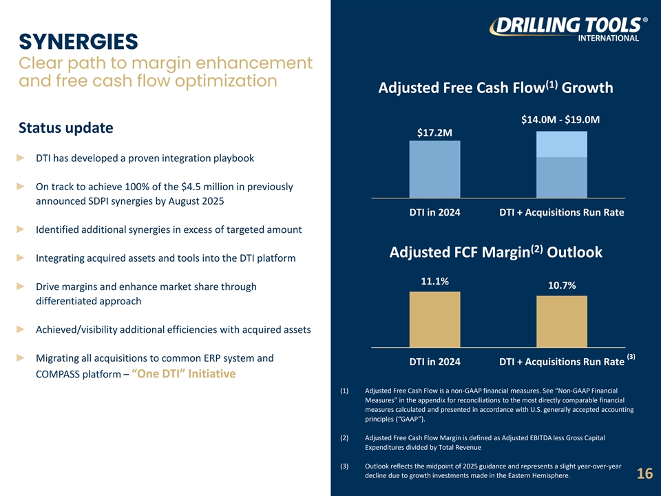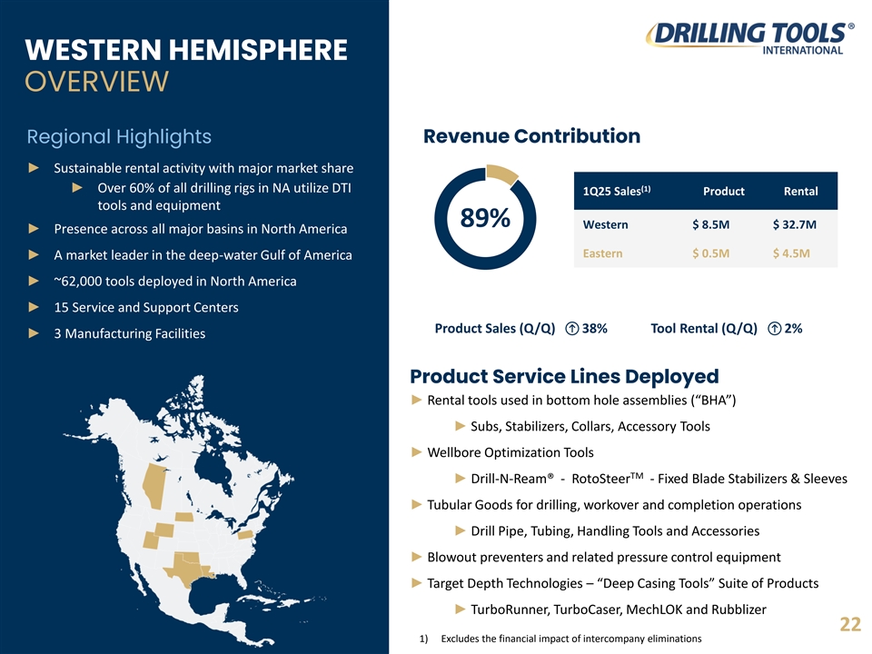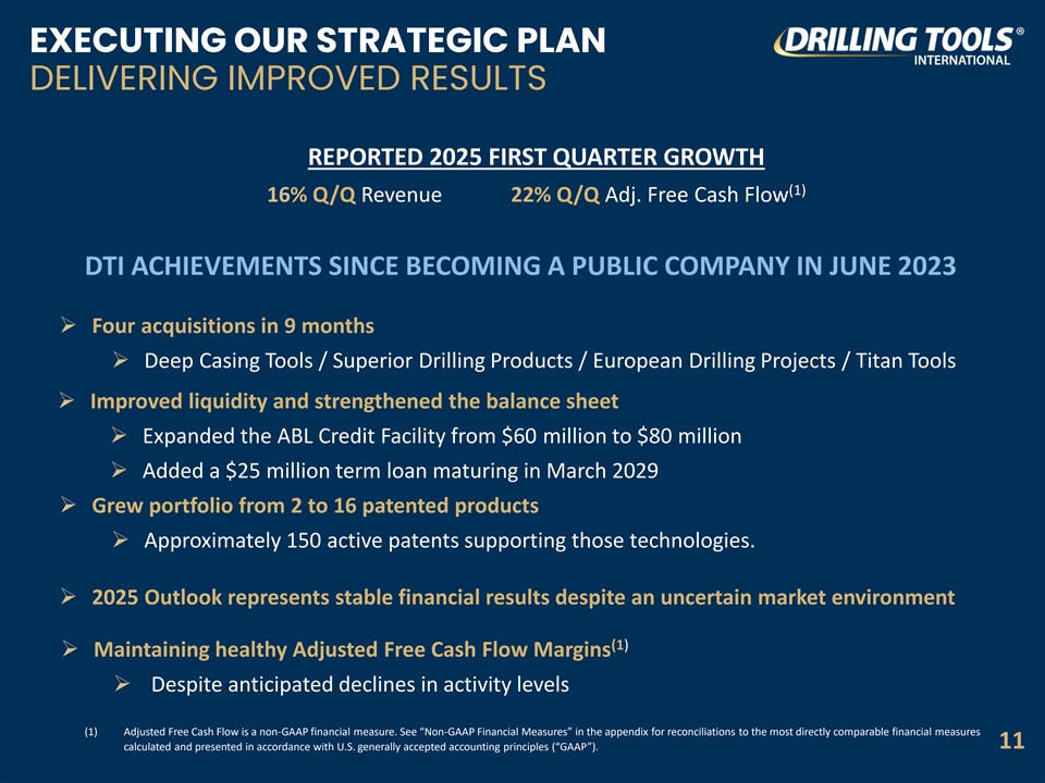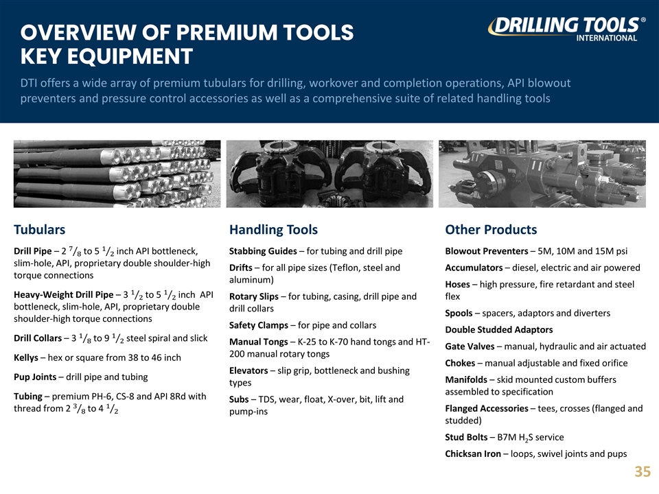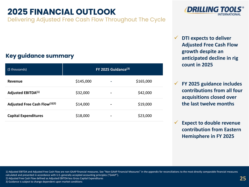FORWARD LOOKING STATEMENTS General: Drilling Tools International Corporation (“DTI”) is making this presentation available in connection with the release of its financial results for the three months and full year ended December 31, 2024. The information contained in this presentation does not purport to be all-inclusive or to contain all information that prospective investors may require. Prospective investors are encouraged to conduct their own analysis and review of information contained in this presentation as well as important additional information through the Securities and Exchange Commission’s (“SEC”) EDGAR system at www.sec.gov and on our website at www.drillingtools.com. Forward-Looking Statements: This presentation and the oral statements made in connection herewith include “forward-looking statements” within the meaning of the “safe harbor” provisions of the Private Securities Litigation Reform Act of 1995. DTI’s actual results may differ from its expectations, estimates and projections, and, consequently, you should not rely on these forward-looking statements as predictions of future events. The words “anticipate,” “believe,” “continue,” “could,” “estimate,” “expect,” “intends,” “may,” “might,” “plan,” “possible,” “potential,” “predict,” “project,” “should,” “will,” “would” and similar expressions may identify forward-looking statements, but the absence of these words does not mean that a statement is not forward looking. These forward-looking statements include, but are not limited to, statements regarding DTI and its management team’s expectations, hopes, beliefs, intentions or strategies regarding the future. In addition, any statements that refer to projections, forecasts or other characterizations of future events or circumstances, including any underlying assumptions, are forward-looking statements. Forward-looking statements in this presentation may include, for example, statements about: (1) the demand for DTI’s products and services, which is influenced by the general level activity in the oil and gas industry; (2) DTI’s ability to retain its customers, particularly those that contribute to a large portion of its revenue; (3) DTI’s ability to employ and retain a sufficient number of skilled and qualified workers, including its key personnel; (4) DTI’s ability to market its services in a competitive industry; (5) DTI’s ability to execute, integrate and realize the benefits of acquisitions, and manage the resulting growth of its business; (6) potential liability for claims arising from damage or harm caused by the operation of DTI’s tools, or otherwise arising from the dangerous activities that are inherent in the oil and gas industry; (7) DTI’s ability to obtain additional capital; (8) potential political, regulatory, economic and social disruptions in the countries in which DTI conducts business, including changes in tax laws or tax rates; (9) DTI’s dependence on its information technology systems, in particular Customer Order Management Portal and Support System, for the efficient operation of DTI’s business; (10) DTI’s ability to comply with applicable laws, regulations and rules, including those related to the environment, greenhouse gases and climate change; (11) DTI’s ability to maintain an effective system of disclosure controls and internal control over financial reporting; (12) the potential for volatility in the market price of DTI’s common stock; (13) the impact of increased legal, accounting, administrative and other costs incurred as a public company, including the impact of possible shareholder litigation; (14) the potential for issuance of additional shares of DTI’s common stock or other equity securities; (15) DTI’s ability to maintain the listing of its common stock on Nasdaq; and (16) other risks and uncertainties separately provided to you and indicated from time to time described in DTI’s most recent Forms 10-K, 10-Q and 8-K filed with or furnished to the SEC. These forward-looking statements are based on DTI management's current expectations and assumptions about future events and are based on currently available information as to the outcome and timing of future events. DTI cautions that the foregoing list of factors is not exclusive and not to place undue reliance upon any forward-looking statements, including projections, which speak only as of the date made. You should also carefully consider the risks and uncertainties described and the information presented in DTI’s current annual report on Form 10-K filed March 14, 2025 and in subsequent current, quarterly and annual reports filed with or furnished to the SEC. These filings or potential filings may identify and address other important risks and uncertainties that could cause actual events and results to differ materially from those contained in the forward-looking statements referred hereto. DTI undertakes no obligation to and accepts no obligation to release publicly any updates or revisions to any forward-looking statements or to reflect any change in its expectations or any change in events, conditions or circumstances on which any such statement is based, except as required by law. Industry, Market Data and Partnerships: In this presentation, DTI relies on and refers to certain information and statistics regarding the markets and industries in which DTI competes. Such information and statistics are based on management’s estimates and/or obtained from third-party sources, including reports by market research firms and company filings. While DTI believes such third-party information is reliable, there can be no assurance as to the accuracy or completeness of the indicated information. DTI has not independently verified the accuracy or completeness of the information provided by the third-party sources. This presentation contains descriptions of certain key busines