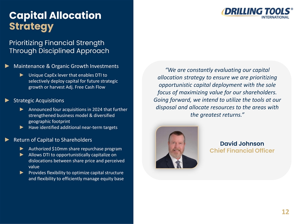 EXECUTING OUR STRATEGIC PLAN DELIVERING IMPROVED RESULTS REPORTED 2025 FIRST QUARTER GROWTH (1) 16% Q/Q Revenue 22% Q/Q Adj. Free Cash Flow DTI ACHIEVEMENTS SINCE BECOMING A PUBLIC COMPANY IN JUNE 2023 ➢ Four acquisitions in 9 months ➢ Deep Casing Tools / Superior Drilling Products / European Drilling Projects / Titan Tools ➢ Improved liquidity and strengthened the balance sheet ➢ Expanded the ABL Credit Facility from $60 million to $80 million ➢ Added a $25 million term loan maturing in March 2029 ➢ Grew portfolio from 2 to 16 patented products ➢ Approximately 150 active patents supporting those technologies. ➢ 2025 Outlook represents stable financial results despite an uncertain market environment (1) ➢ Maintaining healthy Adjusted Free Cash Flow Margins ➢ Despite anticipated declines in activity levels (1) Adjusted Free Cash Flow is a non-GAAP financial measure. See “Non-GAAP Financial Measures” in the appendix for reconciliations to the most directly comparable financial measures 11 calculated and presented in accordance with U.S. generally accepted accounting principles (“GAAP”).