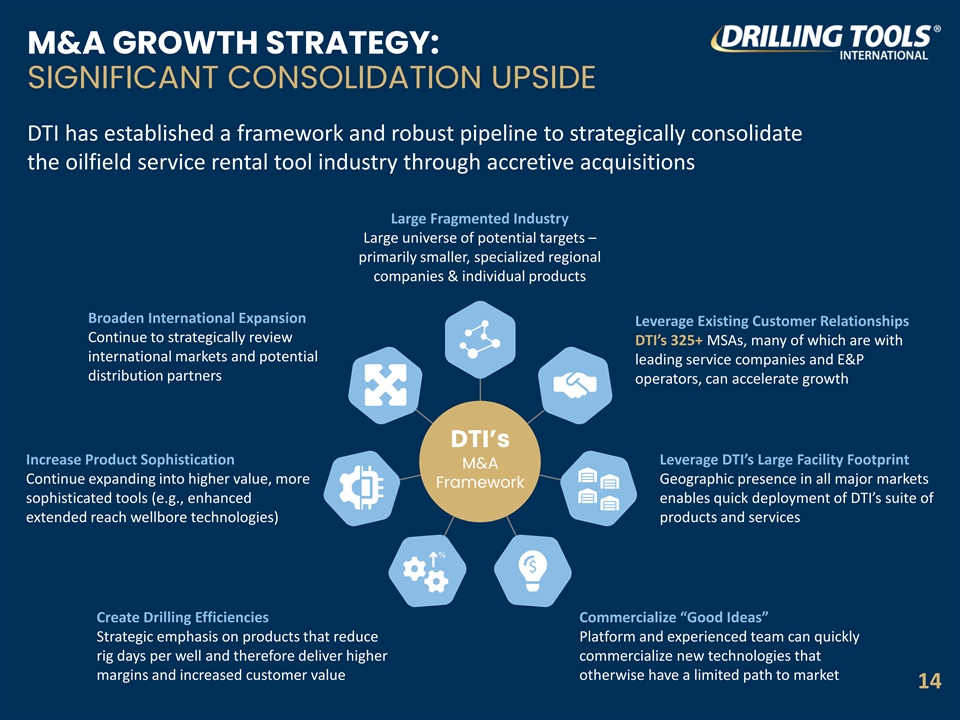 ORGANIC GROWTH DRIVERS ✓ 2025 results will include a full year of contributions from all acquisitions announced in 2024 ✓ Leverage our global footprint of distribution and sales channel to market ✓ Expand scope of tools & services through technological advancements ✓ Leading edge downhole technology for extended reach drilling ✓ Proprietary examples: Deep Casing Tools / Next Generation Stabilizers –Fixed Blade TM TM ✓ RotoSteer / Drill-N-Ream® / SafeFloat ✓ Grow customer base and gain global market share utilizing acquisitions / technology ✓ Trend towards longer laterals favors DTI’s new technology ✓ International markets adopting unconventional “shale type” drilling applications ✓ DTI is well positioned to supply in those markets 13