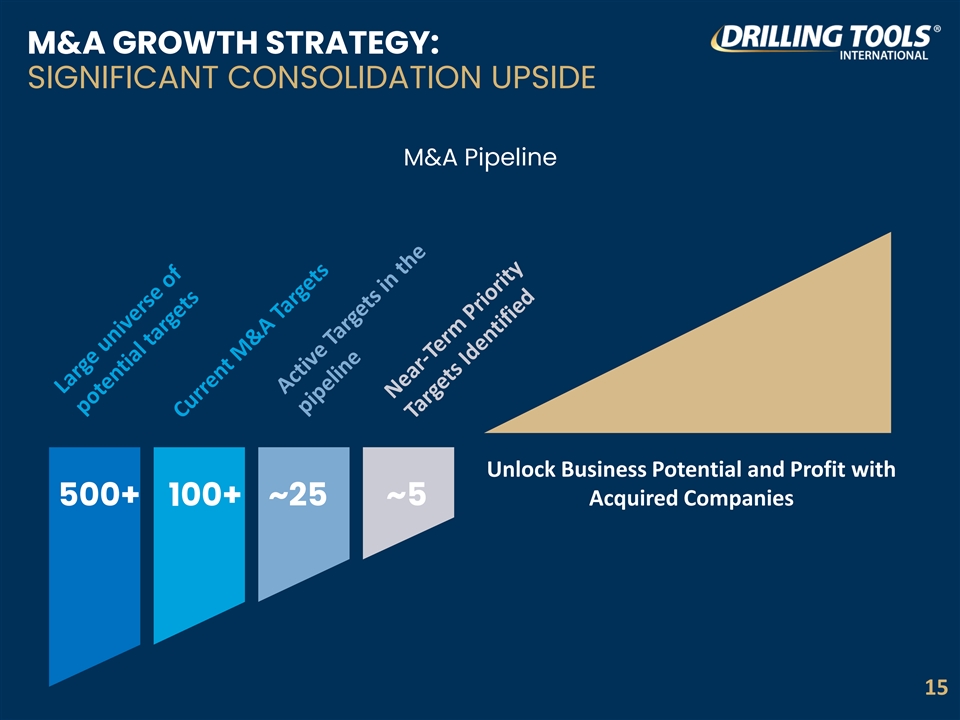 M&A GROWTH STRATEGY: SIGNIFICANT CONSOLIDATION UPSIDE DTI has established a framework and robust pipeline to strategically consolidate the oilfield service rental tool industry through accretive acquisitions Large Fragmented Industry Large universe of potential targets – primarily smaller, specialized regional companies & individual products Broaden International Expansion Leverage Existing Customer Relationships Continue to strategically review DTI’s 325+ MSAs, many of which are with international markets and potential leading service companies and E&P distribution partners operators, can accelerate growth DTI’s Increase Product Sophistication Leverage DTI’s Large Facility Footprint M&A Continue expanding into higher value, more Geographic presence in all major markets Framework sophisticated tools (e.g., enhanced enables quick deployment of DTI’s suite of extended reach wellbore technologies) products and services Create Drilling Efficiencies Commercialize “Good Ideas” Strategic emphasis on products that reduce Platform and experienced team can quickly rig days per well and therefore deliver higher commercialize new technologies that margins and increased customer value otherwise have a limited path to market 14