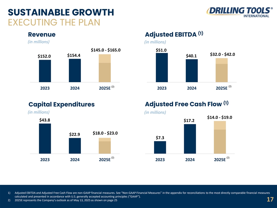SYNERGIES Clear path to margin enhancement and free cash flow optimization (1) Adjusted Free Cash Flow Growth $14.0M - $19.0M Status update $17.2M ► DTI has developed a proven integration playbook ► On track to achieve 100% of the $4.5 million in previously announced SDPI synergies by August 2025 DTI in 2024 DTI + Acquisitions Run Rate ► Identified additional synergies in excess of targeted amount (2) Adjusted FCF Margin Outlook ► Integrating acquired assets and tools into the DTI platform 11.1% 10.7% ► Drive margins and enhance market share through differentiated approach ► Achieved/visibility additional efficiencies with acquired assets (3) ► Migrating all acquisitions to common ERP system and DTI in 2024 DTI + Acquisitions Run Rate COMPASS platform – “One DTI” Initiative (1) Adjusted Free Cash Flow is a non-GAAP financial measures. See “Non-GAAP Financial Measures” in the appendix for reconciliations to the most directly comparable financial measures calculated and presented in accordance with U.S. generally accepted accounting principles (“GAAP”). (2) Adjusted Free Cash Flow Margin is defined as Adjusted EBITDA less Gross Capital Expenditures divided by Total Revenue (3) Outlook reflects the midpoint of 2025 guidance and represents a slight year-over-year decline due to growth investments made in the Eastern Hemisphere. 16