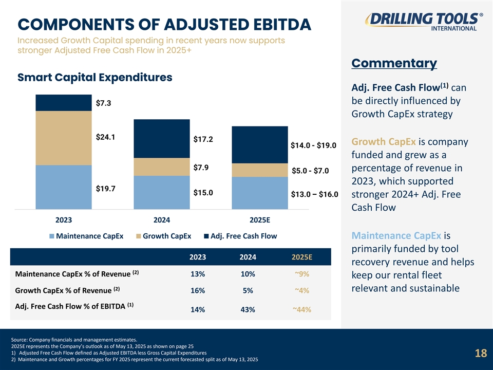 SUSTAINABLE GROWTH EXECUTING THE PLAN (1) Revenue Adjusted EBITDA (in millions) (in millions) $145.0 - $165.0 $51.0 $32.0 - $42.0 $154.4 $40.1 $152.0 (2) (2) 2023 2024 2025E 2023 2024 2025E (1) Adjusted Free Cash Flow Capital Expenditures (in millions) (in millions) $14.0 - $19.0 $43.8 $17.2 $18.0 - $23.0 $22.9 $7.3 (2) (2) 2023 2024 2025E 2023 2024 2025E 1) Adjusted EBITDA and Adjusted Free Cash Flow are non-GAAP financial measures. See “Non-GAAP Financial Measures” in the appendix for reconciliations to the most directly comparable financial measures calculated and presented in accordance with U.S. generally accepted accounting principles (“GAAP”). 2) 2025E represents the Company’s outlook as of May 13, 2025 as shown on page 25 17