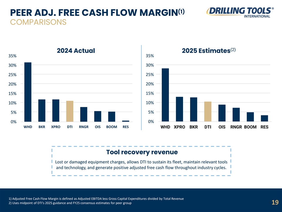 COMPONENTS OF ADJUSTED EBITDA Increased Growth Capital spending in recent years now supports stronger Adjusted Free Cash Flow in 2025+ Commentary Smart Capital Expenditures (1) Adj. Free Cash Flow can be directly influenced by $7.3 Growth CapEx strategy $24.1 $17.2 Growth CapEx is company $14.0 - $19.0 funded and grew as a $7.9 percentage of revenue in $5.0 - $7.0 2023, which supported $19.7 $15.0 $13.0 – $16.0 stronger 2024+ Adj. Free Cash Flow 2023 2024 2025E Maintenance CapEx Growth CapEx Adj. Free Cash Flow Maintenance CapEx is primarily funded by tool 2023 2024 2025E recovery revenue and helps (2) Maintenance CapEx % of Revenue 13% 10% ~9% keep our rental fleet (2) relevant and sustainable Growth CapEx % of Revenue 16% 5% ~4% (1) Adj. Free Cash Flow % of EBITDA 14% 43% ~44% Source: Company financials and management estimates. 2025E represents the Company’s outlook as of May 13, 2025 as shown on page 25 1) Adjusted Free Cash Flow defined as Adjusted EBITDA less Gross Capital Expenditures 18 2) Maintenance and Growth percentages for FY 2025 represent the current forecasted split as of May 13, 2025