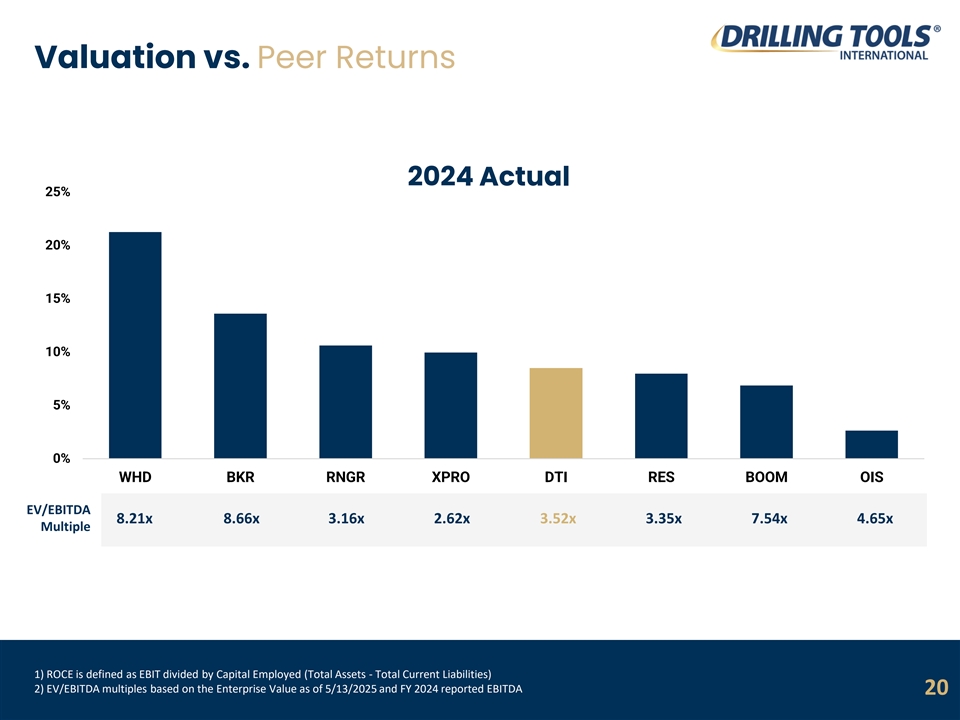 Valuation vs. Peer Returns 2024 Actual 25% 20% 15% 10% 5% 0% WHD BKR RNGR XPRO DTI RES BOOM OIS EV/EBITDA 8.21x 8.66x 3.16x 2.62x 3.52x 3.35x 7.54x 4.65x Multiple 1) ROCE is defined as EBIT divided by Capital Employed (Total Assets - Total Current Liabilities) 2) EV/EBITDA multiples based on the Enterprise Value as of 5/13/2025 and FY 2024 reported EBITDA 20