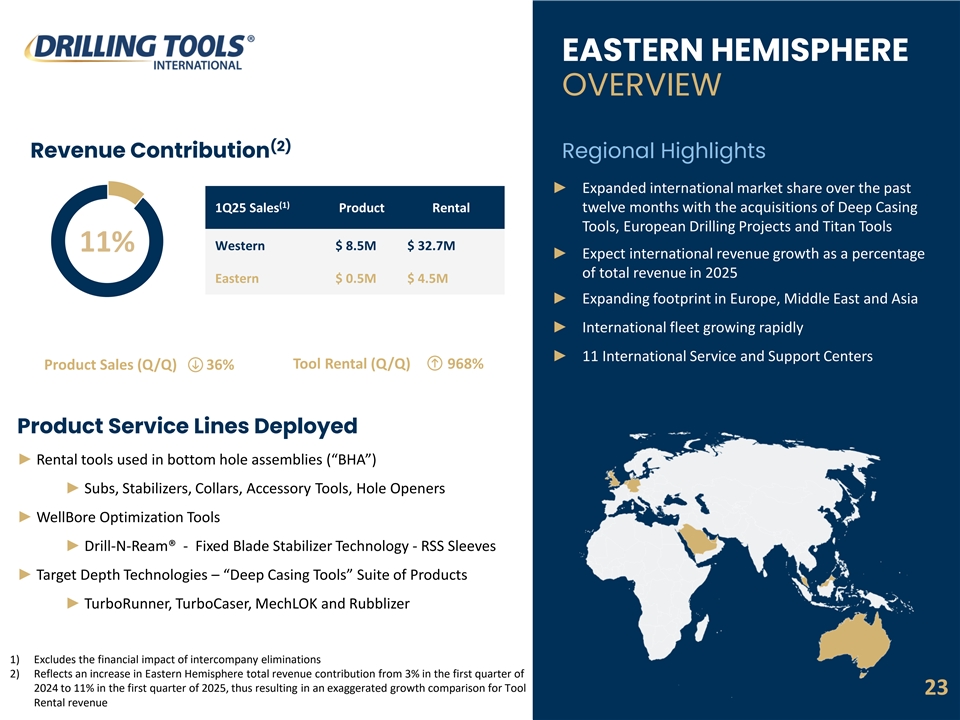WESTERN HEMISPHERE OVERVIEW Regional Highlights Revenue Contribution ► Sustainable rental activity with major market share (1) ► Over 60% of all drilling rigs in NA utilize DTI 1Q25 Sales Product Rental tools and equipment 89% Western $ 8.5M $ 32.7M ► Presence across all major basins in North America Eastern $ 0.5M $ 4.5M ► A market leader in the deep-water Gulf of America ► ~62,000 tools deployed in North America ► 15 Service and Support Centers Product Sales (Q/Q) 38% Tool Rental (Q/Q) 2% ► 3 Manufacturing Facilities Product Service Lines Deployed ► Rental tools used in bottom hole assemblies (“BHA”) ► Subs, Stabilizers, Collars, Accessory Tools ► Wellbore Optimization Tools TM ► Drill-N-Ream® - RotoSteer - Fixed Blade Stabilizers & Sleeves ► Tubular Goods for drilling, workover and completion operations ► Drill Pipe, Tubing, Handling Tools and Accessories ► Blowout preventers and related pressure control equipment ► Target Depth Technologies – “Deep Casing Tools” Suite of Products ► TurboRunner, TurboCaser, MechLOK and Rubblizer 22 1) Excludes the financial impact of intercompany eliminations