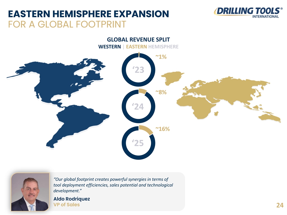 EASTERN HEMISPHERE EXPANSION FOR A GLOBAL FOOTPRINT GLOBAL REVENUE SPLIT WESTERN | EASTERN HEMISPHERE ~1% ‘23 ~8% ‘24 ~16% ‘25 “Our global footprint creates powerful synergies in terms of tool deployment efficiencies, sales potential and technological development.” Aldo Rodriquez VP of Sales 24