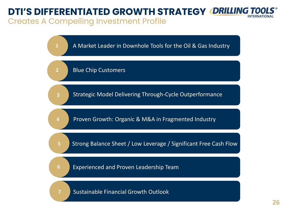 2025 FINANCIAL OUTLOOK Delivering Adjusted Free Cash Flow Throughout The Cycle ✓ DTI expects to deliver Adjusted Free Cash Flow growth despite an Key guidance summary anticipated decline in rig count in 2025 (3) ($ thousands) FY 2025 Guidance Revenue $145,000 - $165,000 ✓ FY 2025 guidance includes contributions from all four (1) Adjusted EBITDA $32,000 - $42,000 acquisitions closed over (1)(2) Adjusted Free Cash Flow $14,000 - $19,000 the last twelve months Capital Expenditures $18,000 - $23,000 ✓ Expect to double revenue contribution from Eastern Hemisphere in FY 2025 1) Adjusted EBITDA and Adjusted Free Cash Flow are non-GAAP financial measures. See “Non-GAAP Financial Measures” in the appendix for reconciliations to the most directly comparable financial measures calculated and presented in accordance with U.S. generally accepted accounting principles (“GAAP”). 2) Adjusted Free Cash Flow defined as Adjusted EBITDA less Gross Capital Expenditures 25 3) Guidance is subject to change dependent upon market conditions