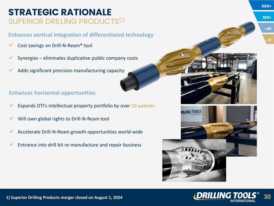 500+ STRATEGIC RATIONALE 100+ (1) DEEP CASING TOOLS ~25 Adds to DTI’s technology platform ~5 ✓ Expands intellectual property portfolio by over 60 patents Adds strong international customer relationships ✓ ADNOC / ARAMCO / PEMEX / PETROBRAS / PETRONAS Accretive to DTI’s earnings and Adj. Free Cash Flow profile Opportunity to expand Deep Casing products into North America 1) Deep Casing Tools merger closed on March 18, 2024 29