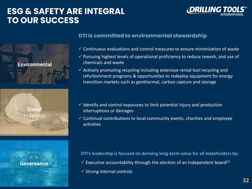 ESG & SAFETY ARE INTEGRAL TO OUR SUCCESS DTI is committed to environmental stewardship ✓ Continuous evaluations and control measures to ensure minimization of waste ✓ Pursuing highest levels of operational proficiency to reduce rework, and use of chemicals and waste Environmental ✓ Actively promoting recycling including extensive rental tool recycling and refurbishment programs & opportunities to redeploy equipment for energy transition markets such as geothermal, carbon capture and storage ✓ Identify and control exposures to limit potential injury and production Social interruptions or damages (+Safety) ✓ Continual contributions to local community events, charities and employee activities DTI’s leadership is focused on deriving long-term value for all stakeholders by: (1) ✓ Executive accountability through the election of an independent board Governance ✓ Strong internal controls 32