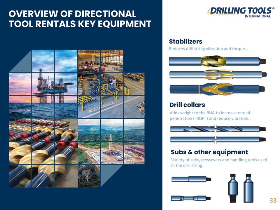 OVERVIEW OF DIRECTIONAL TOOL RENTALS KEY EQUIPMENT Stabilizers Reduces drill string vibration and torque… Drill collars Adds weight to the BHA to increase rate of penetration (“ROP”) and reduce vibration… Subs & other equipment Variety of subs, crossovers and handling tools used in the drill string 33