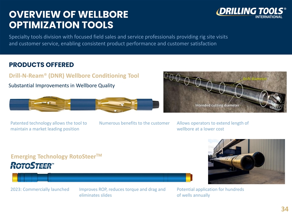 OVERVIEW OF WELLBORE OPTIMIZATION TOOLS Specialty tools division with focused field sales and service professionals providing rig site visits and customer service, enabling consistent product performance and customer satisfaction PRODUCTS OFFERED Drill-N-Ream® (DNR) Wellbore Conditioning Tool Substantial Improvements in Wellbore Quality Patented technology allows the tool to Numerous benefits to the customer Allows operators to extend length of maintain a market leading position wellbore at a lower cost TM Emerging Technology RotoSteer 2023: Commercially launched Improves ROP, reduces torque and drag and Potential application for hundreds eliminates slides of wells annually 34
