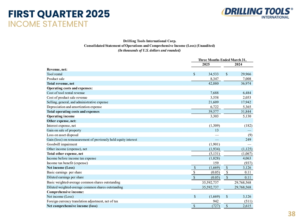 FIRST QUARTER 2025 INCOME STATEMENT Drilling Tools International Corp. Consolidated Statement of Operations and Comprehensive Income (Loss) (Unaudited) (In thousands of U.S. dollars and rounded) Three Months Ended March 31, 2025 2024 Revenue, net: Tool rental $ 3 4,533 $ 29,966 Product sale 8 ,347 7 ,008 Total revenue, net 42,880 36,974 Operating costs and expenses: Cost of tool rental revenue 7,688 6,484 Cost of product sale revenue 3,558 2 ,053 Selling, general, and administrative expense 21,609 1 7,942 Depreciation and amortization expense 6,722 5 ,365 Total operating costs and expenses 3 9,577 3 1,844 Operating income 3 ,303 5,130 Other expense, net: Interest expense, net (1,309) (182) Gain on sale of property 13 — Loss on asset disposal — (9) Gain (loss) on remeasurement of previously held equity interest — 249 Goodwill impairment (1,901) — Other income (expense), net (1,934) (1,125) Total other expense, net (5,131) ( 1,067) Income before income tax expense (1,828) 4 ,063 Income tax benefit (expense) 159 ( 937) Net income (Loss) $ ( 1,669) $ 3 ,126 Basic earnings per share $ (0.05) $ 0 .11 Diluted earnings per share $ ( 0.05) $ 0 .11 Basic weighted-average common shares outstanding 35,592,737 29,768,568 Diluted weighted-average common shares outstanding 3 5,592,737 2 9,768,568 Comprehensive income: Net income (Loss) $ (1,669) $ 3,126 Foreign currency translation adjustment, net of tax 942 (511) Net comprehensive income (loss) $ (727) $ 2 ,615 38