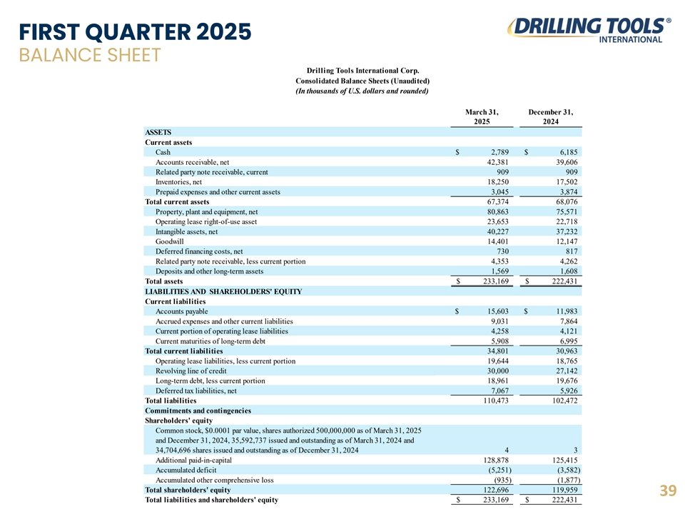 FIRST QUARTER 2025 BALANCE SHEET Drilling Tools International Corp. Consolidated Balance Sheets (Unaudited) (In thousands of U.S. dollars and rounded) March 31, December 31, 2025 2024 ASSETS Current assets Cash $ 2 ,789 $ 6,185 Accounts receivable, net 4 2,381 3 9,606 Related party note receivable, current 909 909 Inventories, net 18,250 17,502 Prepaid expenses and other current assets 3,045 3,874 Total current assets 6 7,374 68,076 Property, plant and equipment, net 8 0,863 7 5,571 Operating lease right-of-use asset 23,653 22,718 Intangible assets, net 40,227 37,232 Goodwill 14,401 12,147 Deferred financing costs, net 730 817 Related party note receivable, less current portion 4 ,353 4,262 Deposits and other long-term assets 1,569 1,608 Total assets $ 2 33,169 $ 2 22,431 LIABILITIES AND SHAREHOLDERS' EQUITY Current liabilities Accounts payable $ 15,603 $ 1 1,983 Accrued expenses and other current liabilities 9 ,031 7 ,864 Current portion of operating lease liabilities 4 ,258 4,121 Current maturities of long-term debt 5 ,908 6,995 Total current liabilities 3 4,801 30,963 Operating lease liabilities, less current portion 1 9,644 18,765 Revolving line of credit 30,000 27,142 Long-term debt, less current portion 1 8,961 1 9,676 Deferred tax liabilities, net 7,067 5,926 Total liabilities 110,473 1 02,472 Commitments and contingencies Shareholders' equity Common stock, $0.0001 par value, shares authorized 500,000,000 as of March 31, 2025 and December 31, 2024, 35,592,737 issued and outstanding as of March 31, 2024 and 34,704,696 shares issued and outstanding as of December 31, 2024 4 3 Additional paid-in-capital 128,878 1 25,415 Accumulated deficit (5,251) (3,582) Accumulated other comprehensive loss (935) (1,877) Total shareholders' equity 1 22,696 119,959 39 Total liabilities and shareholders' equity $ 2 33,169 $ 2 22,431