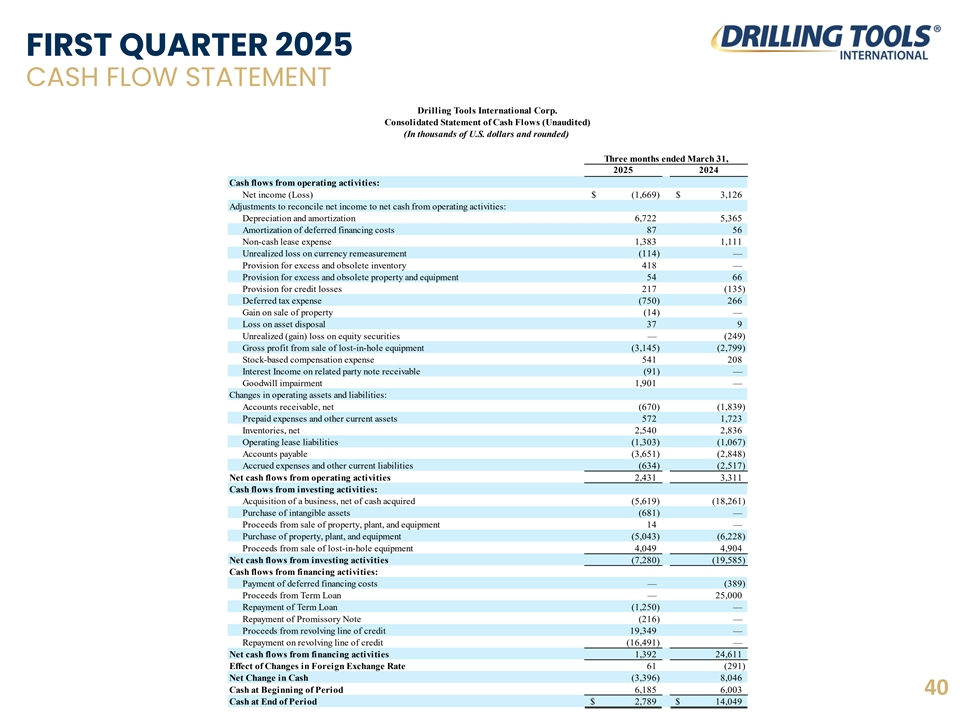 FIRST QUARTER 2025 CASH FLOW STATEMENT Drilling Tools International Corp. Consolidated Statement of Cash Flows (Unaudited) (In thousands of U.S. dollars and rounded) Three months ended March 31, 2025 2024 Cash flows from operating activities: Net income (Loss) $ (1,669) $ 3,126 Adjustments to reconcile net income to net cash from operating activities: Depreciation and amortization 6 ,722 5,365 Amortization of deferred financing costs 87 56 Non-cash lease expense 1,383 1 ,111 Unrealized loss on currency remeasurement (114) — Provision for excess and obsolete inventory 418 — Provision for excess and obsolete property and equipment 54 66 Provision for credit losses 217 (135) Deferred tax expense (750) 266 Gain on sale of property (14) — Loss on asset disposal 37 9 Unrealized (gain) loss on equity securities — (249) Gross profit from sale of lost-in-hole equipment ( 3,145) ( 2,799) Stock-based compensation expense 541 208 Interest Income on related party note receivable ( 91) — Goodwill impairment 1 ,901 — Changes in operating assets and liabilities: Accounts receivable, net ( 670) ( 1,839) Prepaid expenses and other current assets 572 1 ,723 Inventories, net 2,540 2,836 Operating lease liabilities (1,303) (1,067) Accounts payable (3,651) (2,848) Accrued expenses and other current liabilities (634) (2,517) Net cash flows from operating activities 2,431 3 ,311 Cash flows from investing activities: Acquisition of a business, net of cash acquired (5,619) ( 18,261) Purchase of intangible assets (681) — Proceeds from sale of property, plant, and equipment 14 — Purchase of property, plant, and equipment (5,043) ( 6,228) Proceeds from sale of lost-in-hole equipment 4,049 4 ,904 Net cash flows from investing activities (7,280) (19,585) Cash flows from financing activities: Payment of deferred financing costs — (389) Proceeds from Term Loan — 25,000 Repayment of Term Loan ( 1,250) — Repayment of Promissory Note (216) — Proceeds from revolving line of credit 19,349 — Repayment on revolving line of credit (16,491) — Net cash flows from financing activities 1,392 24,611 Effect of Changes in Foreign Exchange Rate 61 ( 291) Net Change in Cash ( 3,396) 8,046 Cash at Beginning of Period 6,185 6 ,003 40 Cash at End of Period $ 2 ,789 $ 14,049
