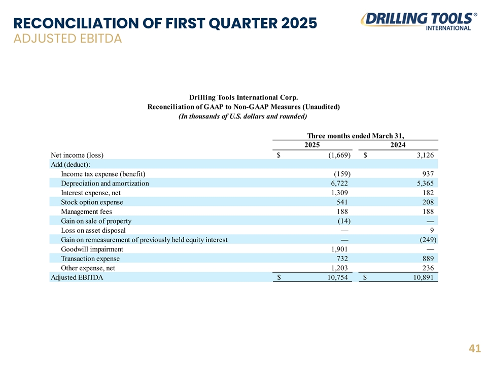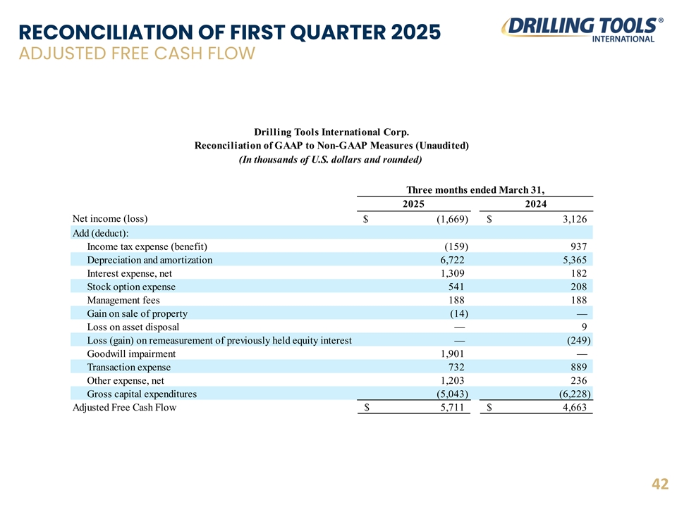 RECONCILIATION OF FIRST QUARTER 2025 ADJUSTED EBITDA Drilling Tools International Corp. Reconciliation of GAAP to Non-GAAP Measures (Unaudited) (In thousands of U.S. dollars and rounded) Three months ended March 31, 2025 2024 Net income (loss) $ ( 1,669) $ 3 ,126 Add (deduct): Income tax expense (benefit) ( 159) 937 Depreciation and amortization 6,722 5,365 Interest expense, net 1,309 182 Stock option expense 541 208 Management fees 188 188 Gain on sale of property ( 14) — Loss on asset disposal — 9 Gain on remeasurement of previously held equity interest — (249) Goodwill impairment 1,901 — Transaction expense 732 889 Other expense, net 1 ,203 236 Adjusted EBITDA $ 10,754 $ 1 0,891 41
