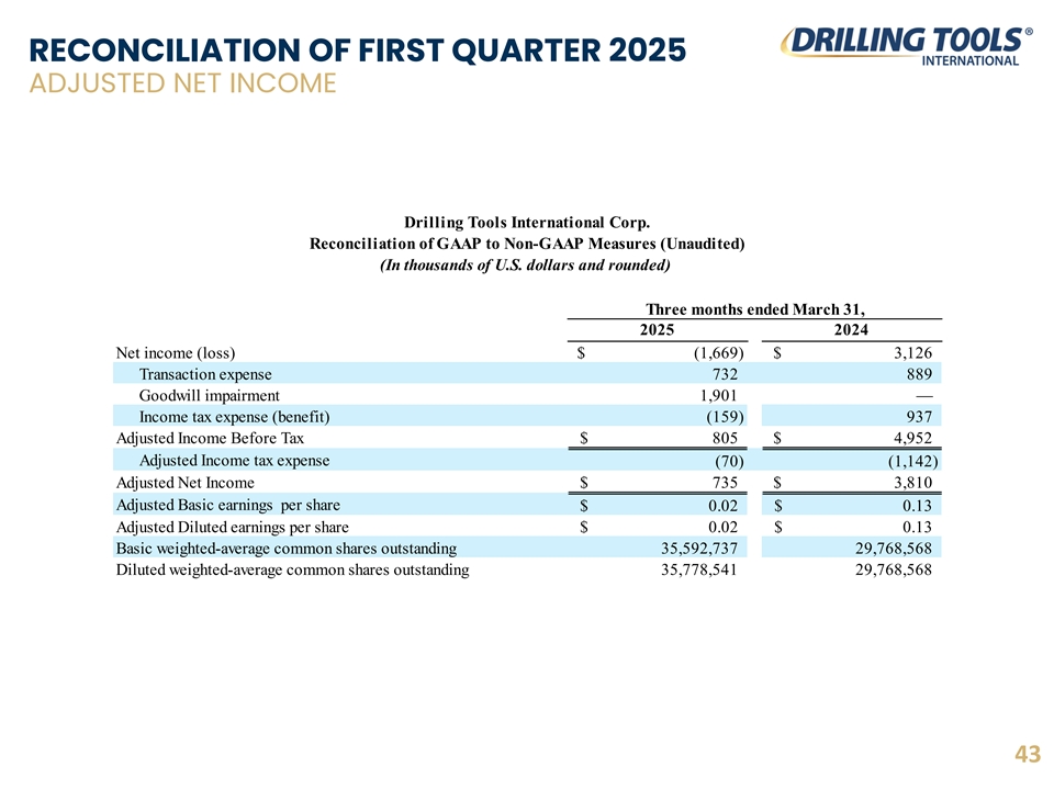 RECONCILIATION OF FIRST QUARTER 2025 ADJUSTED NET INCOME Drilling Tools International Corp. Reconciliation of GAAP to Non-GAAP Measures (Unaudited) (In thousands of U.S. dollars and rounded) Three months ended March 31, 2025 2024 Net income (loss) $ ( 1,669) $ 3 ,126 Transaction expense 732 889 Goodwill impairment 1,901 — Income tax expense (benefit) ( 159) 937 Adjusted Income Before Tax $ 805 $ 4 ,952 Adjusted Income tax expense ( 70) ( 1,142) Adjusted Net Income $ 735 $ 3,810 Adjusted Basic earnings per share $ 0 .02 $ 0 .13 Adjusted Diluted earnings per share $ 0 .02 $ 0 .13 Basic weighted-average common shares outstanding 35,592,737 29,768,568 Diluted weighted-average common shares outstanding 35,778,541 29,768,568 43
