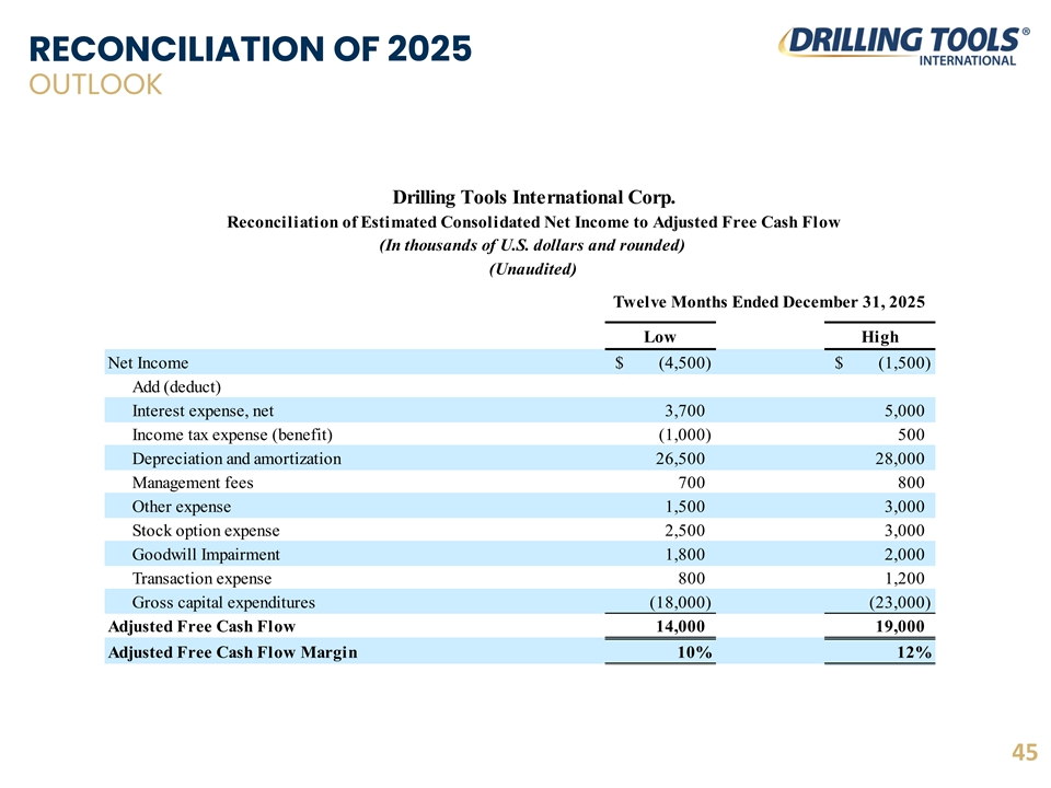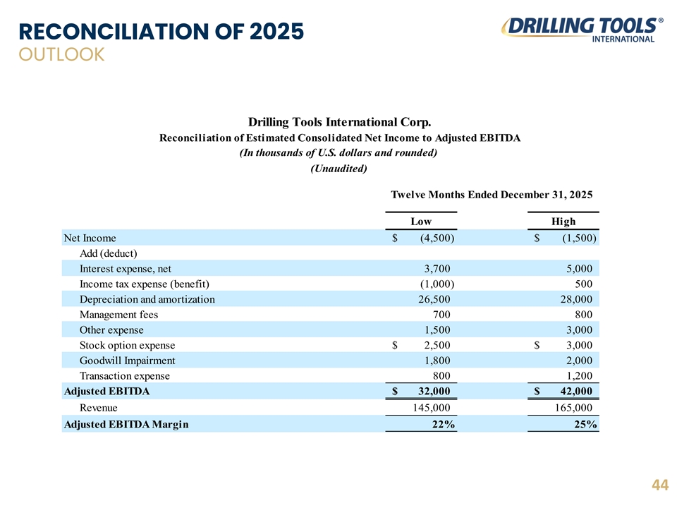 RECONCILIATION OF 2025 OUTLOOK Drilling Tools International Corp. Reconciliation of Estimated Consolidated Net Income to Adjusted EBITDA (In thousands of U.S. dollars and rounded) (Unaudited) Twelve Months Ended December 31, 2025 Low High Net Income $ (4,500) $ (1,500) Add (deduct) Interest expense, net 3,700 5,000 Income tax expense (benefit) (1,000) 500 Depreciation and amortization 2 6,500 2 8,000 Management fees 700 800 Other expense 1,500 3,000 Stock option expense $ 2 ,500 $ 3,000 Goodwill Impairment 1,800 2,000 Transaction expense 800 1,200 Adjusted EBITDA $ 32,000 $ 42,000 Revenue 145,000 165,000 Adjusted EBITDA Margin 22% 25% 44