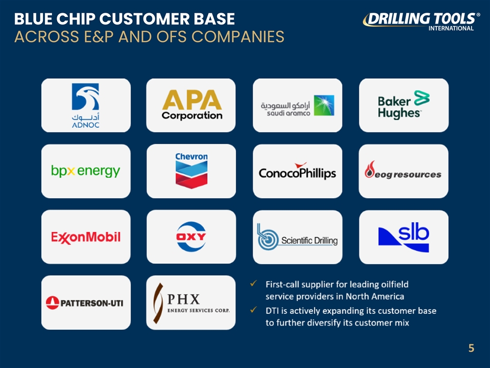 THE LIFECYCLE TO PROVIDE MISSION CRITICAL DRILLING TOOLS Consistent Revenue Growth Expanding Global Footprint DTI continues to expand globally with extensive operations in North America, Europe, Middle East, $42.9 Million 16% (Q/Q) Africa and throughout Asia Pacific. Q1 2025 revenue reflects Despite a 6% global broad scope and scale rig count decline over the same period Extensive Tool Inventory Q1 2025 Revenue Mix Active rental and market participation on 60% of drilling rigs in North America and growing in the Eastern Hemisphere. 89% 11% Western Hemisphere Eastern Hemisphere 15 service and support 11 service and support facilities facilities Efficient In House Manufacturing & Repair Facilities Building and Maintaining existing fleet and future innovations at a competitive edge. 4