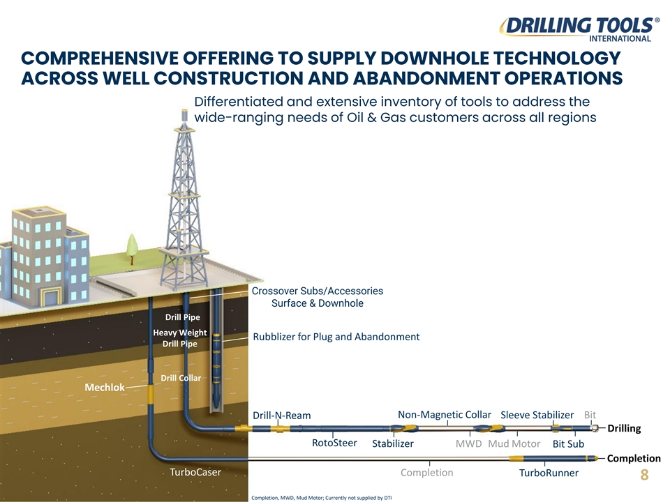 COMPREHENSIVE OFFERING TO SUPPLY DOWNHOLE TECHNOLOGY ACROSS WELL CONSTRUCTION AND ABANDONMENT OPERATIONS Differentiated and extensive inventory of tools to address the wide-ranging needs of Oil & Gas customers across all regions Crossover Subs/Accessories Surface & Downhole Drill Pipe Heavy Weight Rubblizer for Plug and Abandonment Drill Pipe Drill Collar Mechlok Non-Magnetic Collar Sleeve Stabilizer Bit Drill-N-Ream Drilling RotoSteer Stabilizer MWD Mud Motor Bit Sub Completion TurboCaser Completion TurboRunner 8 Completion, MWD, Mud Motor; Currently not supplied by DTI