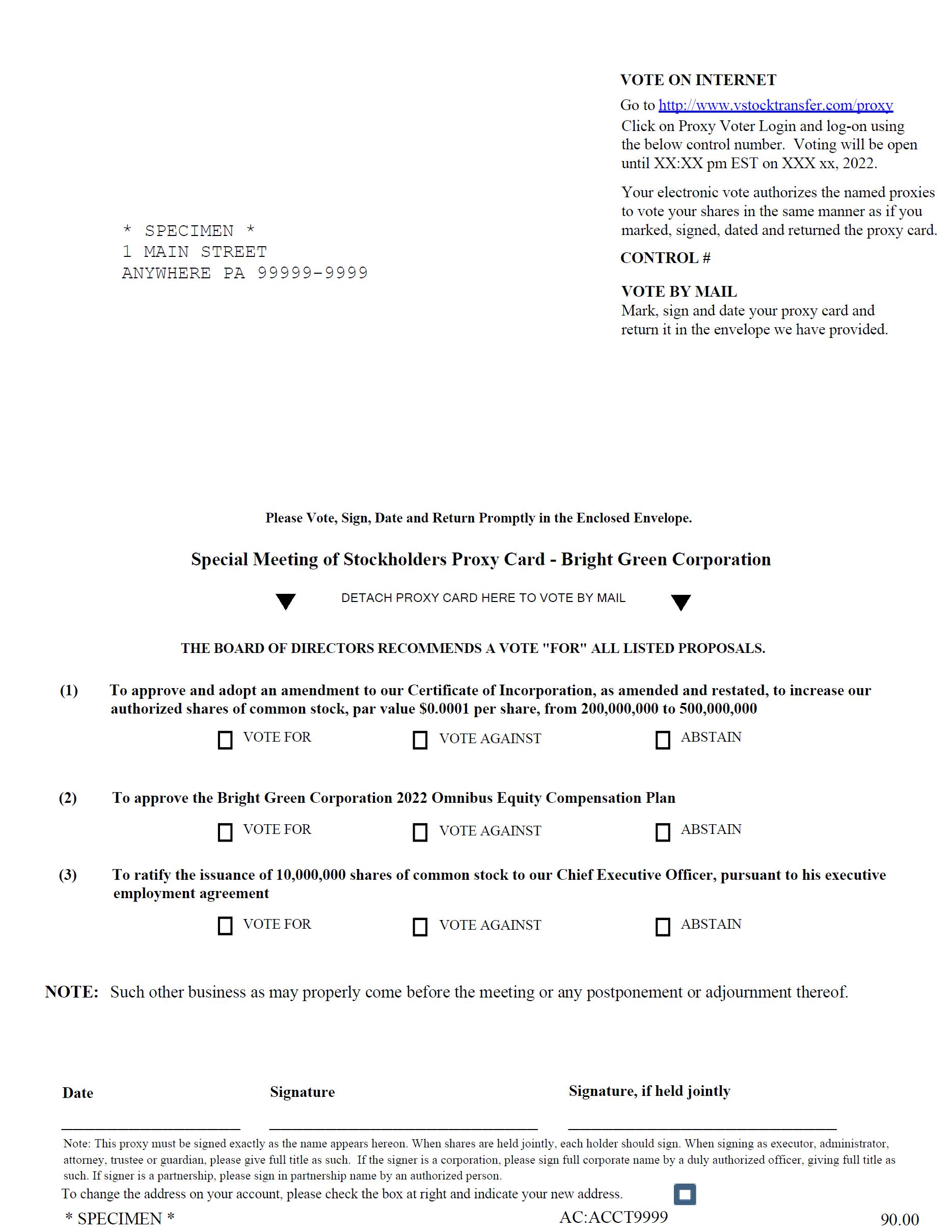 Due to the public health impact of the coronavirus outbreak and to support the health and well-being of our employees, stockholders, and our community, the Special Meeting will be a completely virtual meeting of stockholders, which will be conducted exclusively online at https://www.virtualmeetingportal.com/brightgreencorp/2022.
