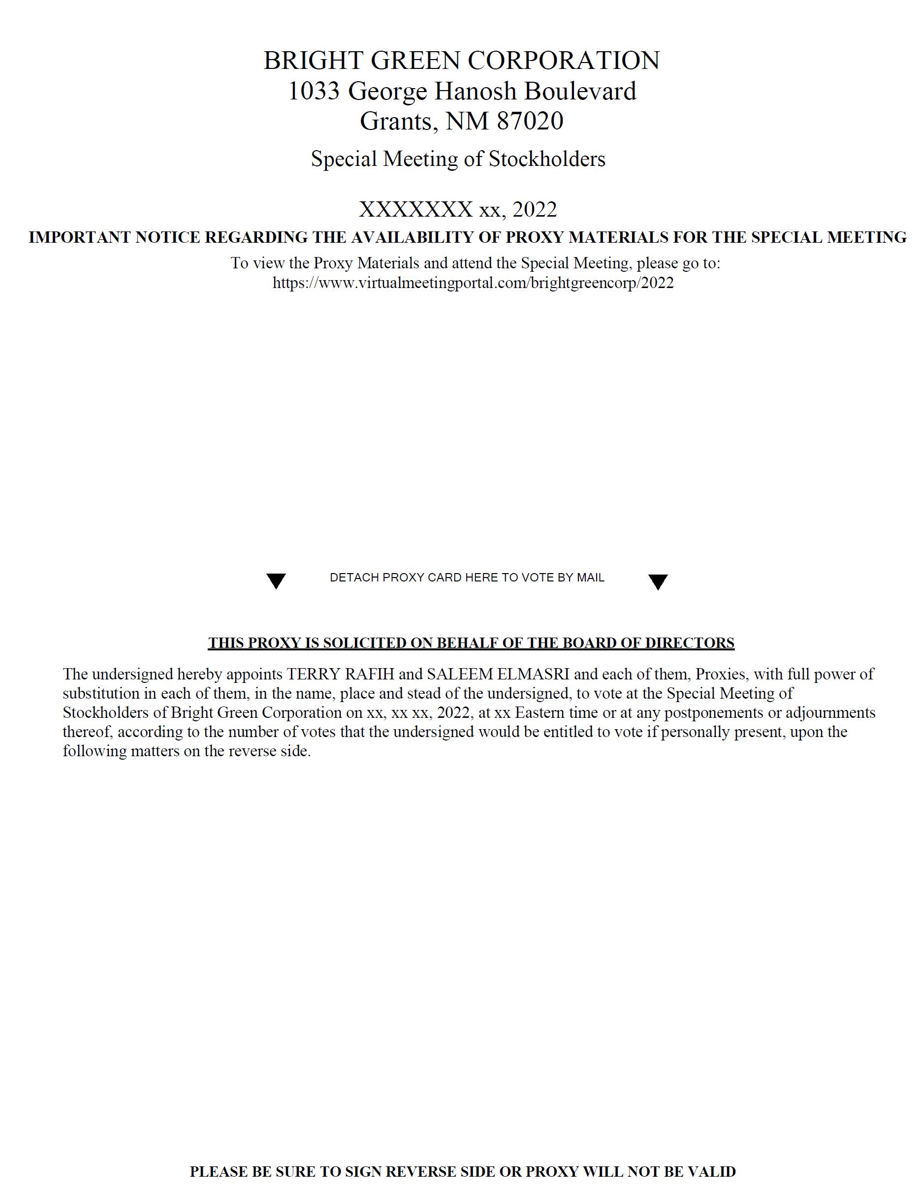 We are pleased to invite you to attend the special meeting of stockholders of Bright Green Corporation (the “Special Meeting”), to be held on [MEETING DATE] at [MEETING TIME], at https://www.virtualmeetingportal.com/brightgreencorp/2022. The Special Meeting will be a completely virtual meeting of stockholders, which will be conducted exclusively on the internet. No physical meeting will be held.