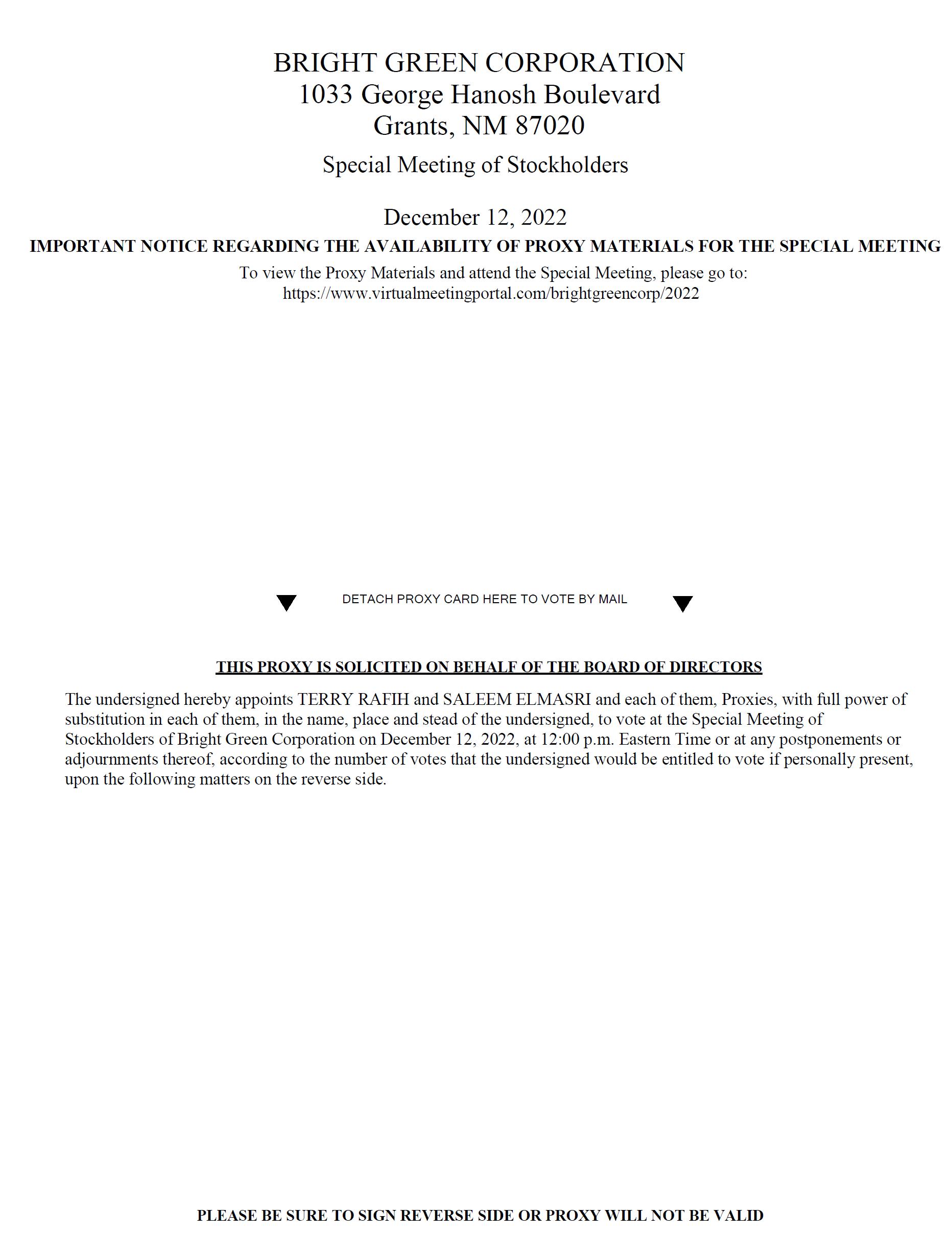 We are pleased to invite you to attend the special meeting of stockholders of Bright Green Corporation (the “Special Meeting”), to be held on December 12, 2022 at 12:00 p.m. Eastern Time, at https://www.virtualmeetingportal.com/brightgreencorp/2022. The Special Meeting will be a completely virtual meeting of stockholders, which will be conducted exclusively on the internet. No physical meeting will be held.