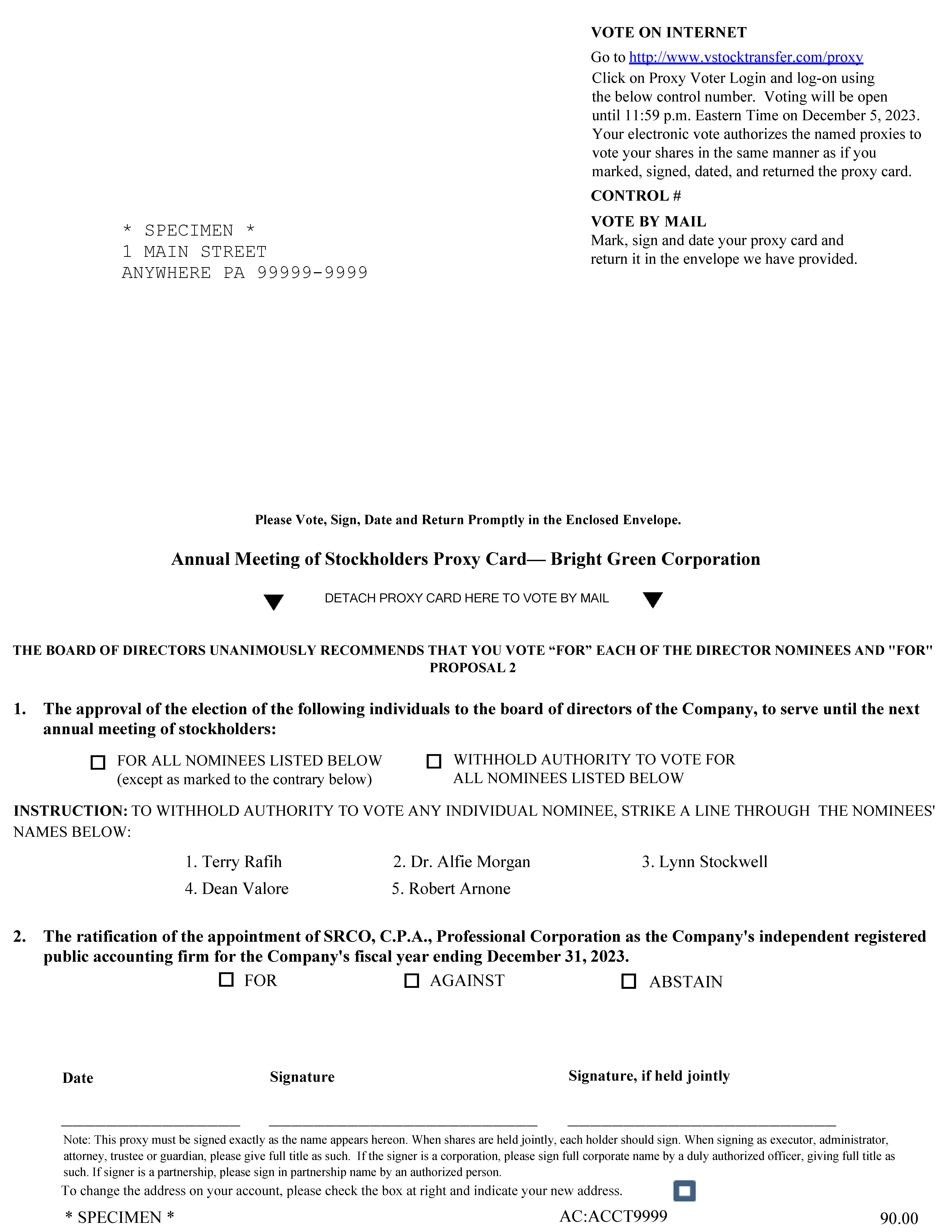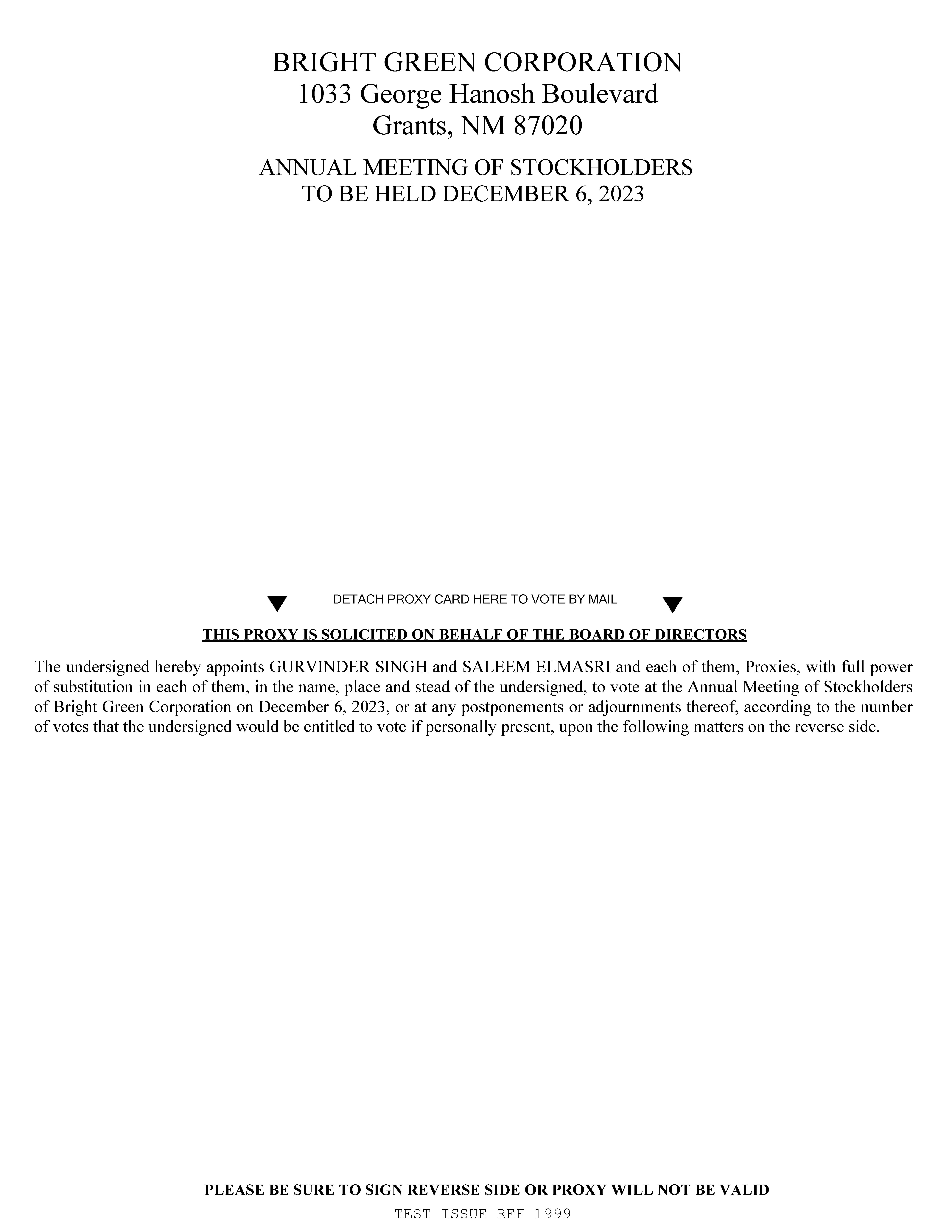 | Items of Business | (1) To elect Robert Arnone, Dr. Alfie Morgan, Terry Rafih, Lynn Stockwell, and Dean Valore, and to the Board of Directors (the “Board”) of Bright Green Corporation (the “Company”), to serve until our next annual meeting of stockholders;