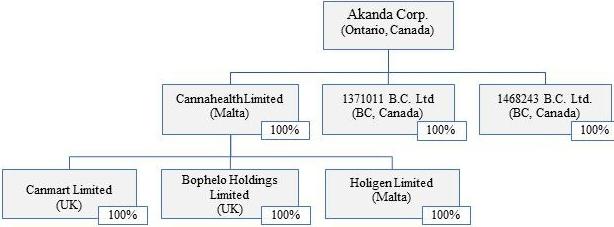 In July 2022, the Company announced that the High Court of Lesotho (the “Lesotho Court”) has placed in liquidation the Company’s, wholly-owned subsidiary, Bophelo Bio Science and Wellness (Pty) Ltd. (“Bophelo”). The action to place Bophelo in liquidation was taken by the Lesotho Court pursuant to an application and request (the “Liquidation Application”) that was filed by Louisa Mojela, the former Executive Chairman of the Company, who was terminated as Executive Chairman of Akanda, and the Mophuti Matsoso Development Trust (“MMD Trust”). Akanda had intended to convene a special committee to investigate Ms. Mojela’s actions and conduct, including actions and conduct taken by her prior to her filing of the Liquidation Application, and further intended to pursue all of its available legal rights and remedies against Ms. Mojela and the MMD Trust for taking this unauthorized action. The Company also intended to contest and seek to reverse the determination by the Lesotho Court to place Bophelo in liquidation and seek to recover significant loans that it has made to Bophelo to fund the execution of Bophelo’s business plan; however, due to lack of funds and resources, the Company is not at this time actively contesting the matter and cannot give no assurance that it will do so in the future. . Finally, Ms. Mojela has been summarily terminated as Chairman of Bophelo for Cause, as a “bad leaver”, as a result of her action to seek to place Bophelo in liquidation. Ms. Mojela has instituted legal proceedings against the Company as a result of the termination of her employment. In an action taken without the Company’s knowledge, the Lesotho Court has ordered an insolvent liquidation of Bophelo, and has appointed Mr. Chavonnes Cooper of Cape Town, South Africa, as liquidator of Bophelo for purposes of maintaining the value of the assets owned or managed by Bophelo. The order was signed by the Honorable Mr. Justice Mokhesi on July 15, 2022.