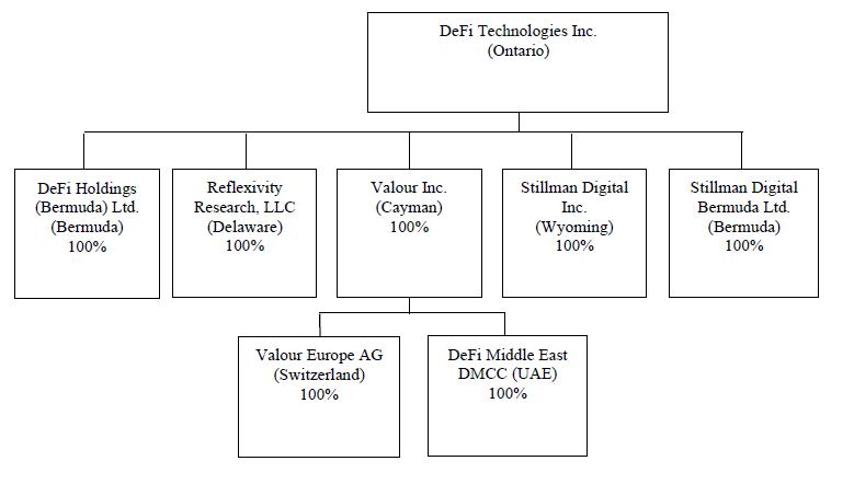 As of the date of this AIF, the Company holds 100% of DeFi Holdings (Bermuda) Ltd., 100% of Reflexivity Research, LLC (“Reflexivity Research”), 100% of Valour Inc. (“Valour Cayman”), 100% of Stillman Digital Inc. (“SDI”), 100% of Stillman Digital Bermuda Ltd. (“SDB” and together with SDI “Stillman Digital”). The following is an organizational chart illustrating the inter-corporate relationships between the Company and its subsidiaries and the jurisdiction of organization of each such entity, as at the date hereof: