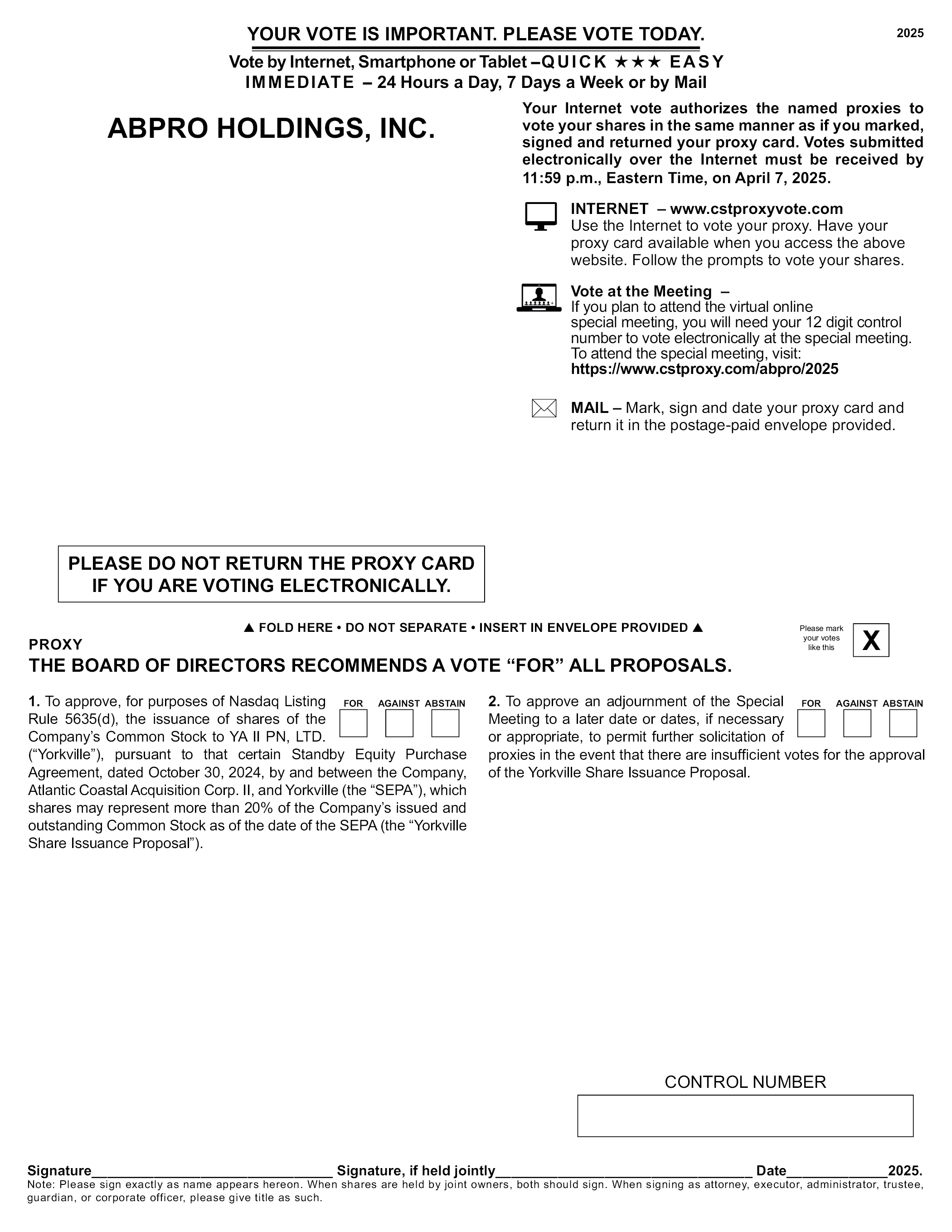 YOUR VOTE IS IMPORTANT. PLEASE VOTE TODAY. 2025 Vote by Internet, Smartphone or Tablet – QUICK EASY IMMEDIATE - 24 Hours a Day, 7 Days a Week or by Mail ABPRO HOLDINGS, INC. Your Internet vote authorizes the named proxies to vote your shares in the same manner as if you marked, signed and returned your proxy card. Votes submitted electronically over the Internet must be received by 11:59 p.m., Eastern Time, on April 7, 2025. INTERNET – www.cstproxyvote.comUse the Internet to vote your proxy. Have your proxy card available when you access the above website. Follow the prompts to vote your shares. Vote at the Meeting – If you plan to attend the virtual online special meeting, you will need your 12 digit control number to vote electronically at the special meeting.To attend the special meeting, visit: https://www.cstproxy.com/abpro/2025 MAIL – Mark, sign and date your proxy card and return it in the postage-paid envelope provided. PLEASE DO NOT RETURN THE PROXY CARD IF YOU ARE VOTING ELECTRONICALLY. FOLD HERE DO NOT SEPARATE INSERT IN ENVELOPE PROVIDED PROXY THE BOARD OF DIRECTORS RECOMMENDS A VOTE “FOR” ALL PROPOSALS. Please mark your votes like this 1. To approve, for purposes of Nasdaq Listing Rule 5635(d), the issuance of shares of the Company’s Common Stock to YA II PN, LTD. (“Yorkville”), pursuant to that certain Standby Equity Purchase Agreement, dated October 30, 2024, by and between the Company, Atlantic Coastal Acquisition Corp. II, and Yorkville (the “SEPA”), which shares may represent more than 20% of the Company’s issued and outstanding Common Stock as of the date of the SEPA (the “Yorkville Share Issuance Proposal”). FOR AGAINST ABSTAIN 2. To approve an adjournment of the Special Meeting to a later date or dates, if necessary or appropriate, to permit further solicitation of proxies in the event that there are insufficient votes for the approval of the Yorkville Share Issuance Proposal. CONTROL NUMBER Signature Signature, if held jointly Date 2025. Note: Please sign exactly as name appears hereon. When shares are held by joint owners, both should sign. When signing as attorney, executor, administrator, trustee, guardian, or corporate officer, please give title as such.