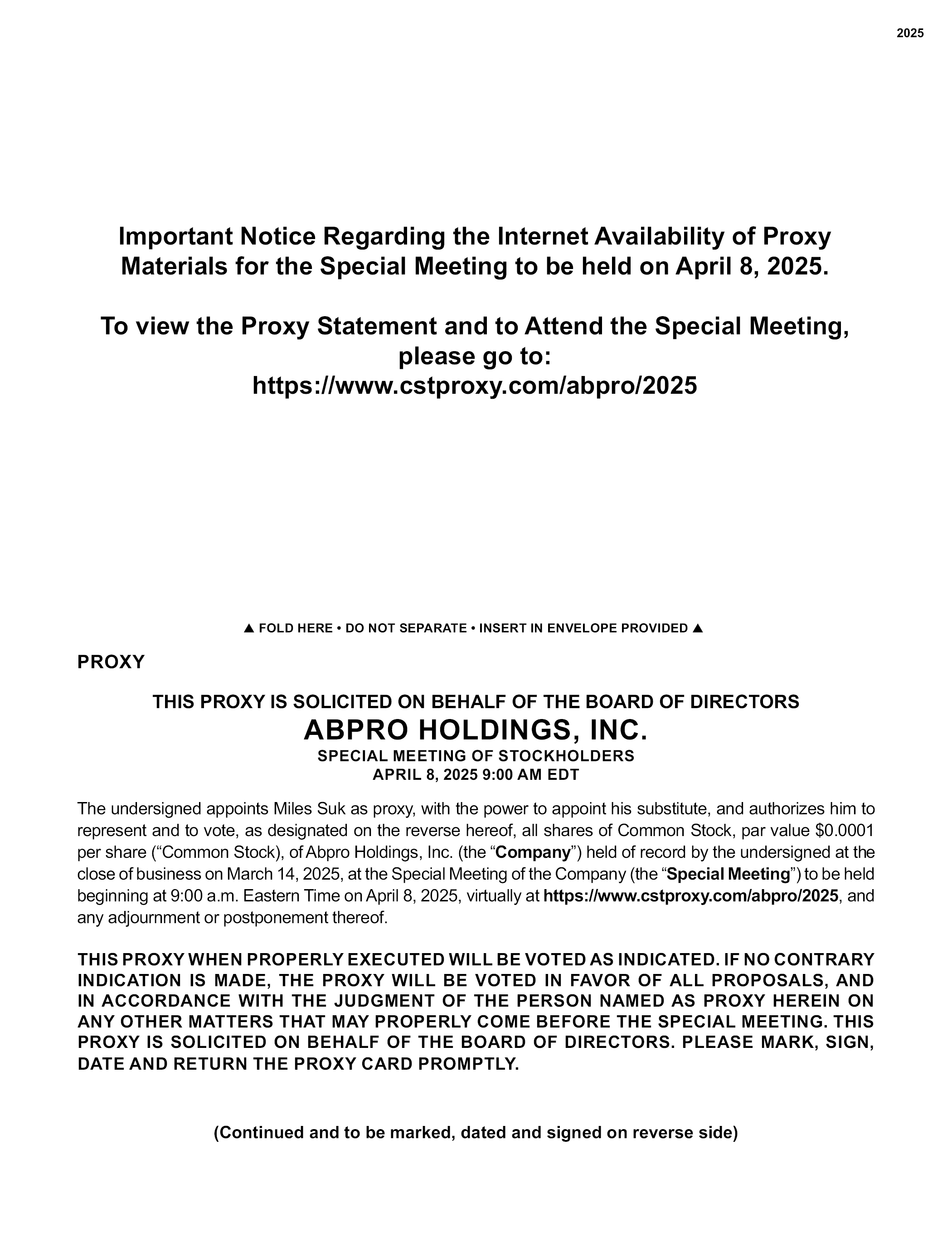 2025 Important Notice Regarding the Internet Availability of Proxy Materials for the Special Meeting to be held on April 8, 2025. To view the Proxy Statement and to Attend the Special Meeting, please go to: https://www.cstproxy.com/abpro/2025 FOLD HERE DO NOT SEPARATE INSERT IN ENVELOPE PROVIDED PROXY THIS PROXY IS SOLICITED ON BEHALF OF THE BOARD OF DIRECTORS ABPRO HOLDINGS, INC. SPECIAL MEETING OF STOCKHOLDERS APRIL 8, 2025 9:00 AM EDT The undersigned appoints Miles Suk as proxy, with the power to appoint his substitute, and authorizes him to represent and to vote, as designated on the reverse hereof, all shares of Common Stock, par value $0.0001 per share (“Common Stock), of Abpro Holdings, Inc. (the “Company”) held of record by the undersigned at the close of business on March 14, 2025, at the Special Meeting of the Company (the “Special Meeting”) to be held beginning at 9:00 a.m. Eastern Time on April 8, 2025, virtually at https://www.cstproxy.com/abpro/2025, and any adjournment or postponement thereof. THIS PROXY WHEN PROPERLY EXECUTED WILL BE VOTED AS INDICATED. IF NO CONTRARY INDICATION IS MADE, THE PROXY WILL BE VOTED IN FAVOR OF ALL PROPOSALS, AND IN ACCORDANCE WITH THE JUDGMENT OF THE PERSON NAMED AS PROXY HEREIN ON ANY OTHER MATTERS THAT MAY PROPERLY COME BEFORE THE SPECIAL MEETING. THIS PROXY IS SOLICITED ON BEHALF OF THE BOARD OF DIRECTORS. PLEASE MARK, SIGN, DATE AND RETURN THE PROXY CARD PROMPTLY. (Continued and to be marked, dated and signed on reverse side)