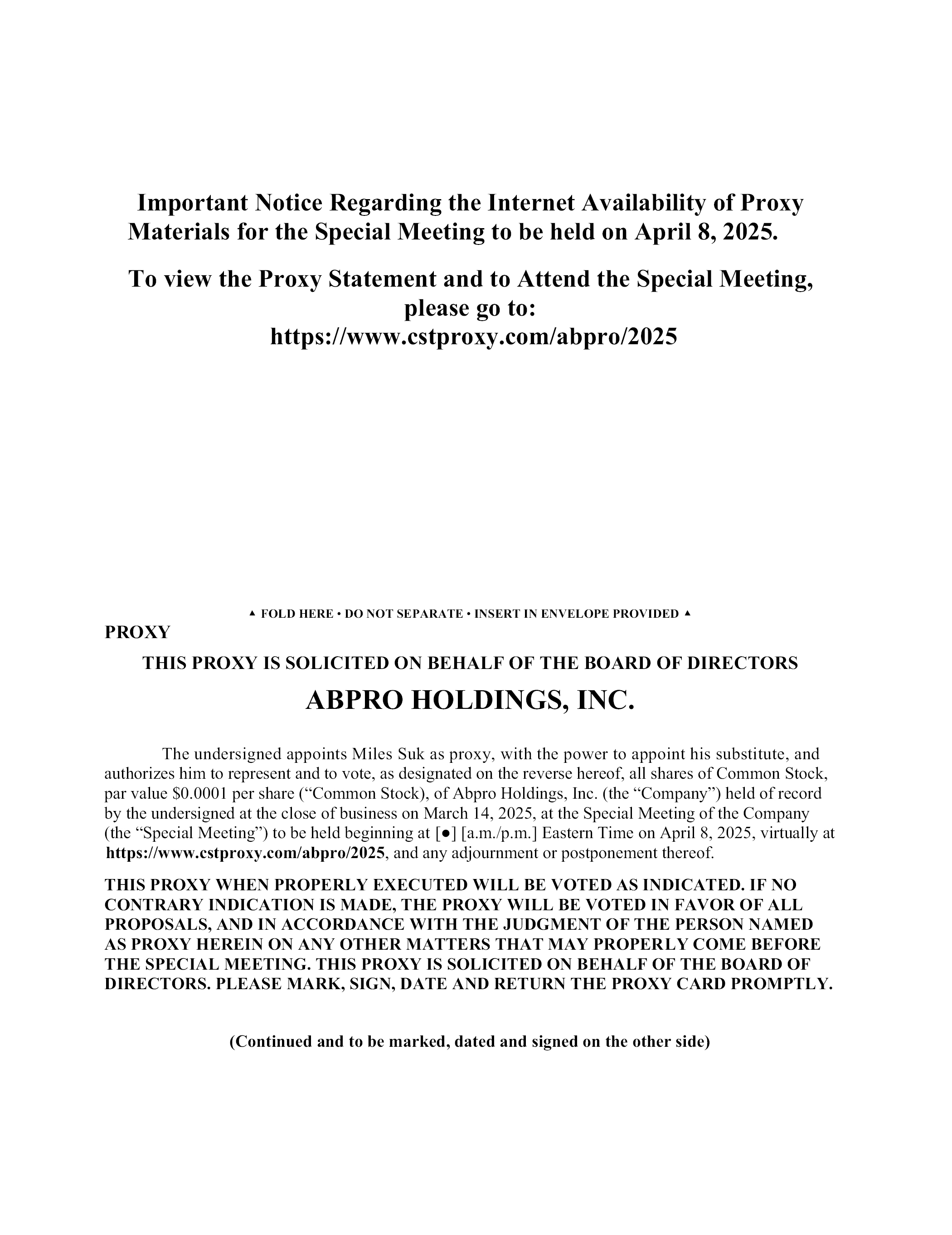 Important Notice Regarding the Internet Availability of Proxy Materials for the Special Meeting to be held on April 8, 2025. To view the Proxy Statement and to Attend the Special Meeting, please go to: https://www.cstproxy.com/abpro/2025 FOLD HERE DO NOT SEPARATE INSERT IN ENVELOPE PROVIDED PROXY THIS PROXY IS SOLICITED ON BEHALF OF THE BOARD OF DIRECTORS ABPRO HOLDINGS, INC. The undersigned appoints Miles Suk as proxy, with the power to appoint his substitute, and authorizes him to represent and to vote, as designated on the reverse hereof, all shares of Common Stock, par value $0.0001 per share (“Common Stock), of Abpro Holdings, Inc. (the “Company”) held of record by the undersigned at the close of business on March 14, 2025, at the Special Meeting of the Company (the “Special Meeting”) to be held beginning at [ ] [a.m./p.m.] Eastern Time on April 8, 2025, virtually at https://www.cstproxy.com/abpro/2025, and any adjournment or postponement thereof. THIS PROXY WHEN PROPERLY EXECUTED WILL BE VOTED AS INDICATED. IF NO CONTRARY INDICATION IS MADE, THE PROXY WILL BE VOTED IN FAVOR OF ALL PROPOSALS, AND IN ACCORDANCE WITH THE JUDGMENT OF THE PERSON NAMED AS PROXY HEREIN ON ANY OTHER MATTERS THAT MAY PROPERLY COME BEFORE THE SPECIAL MEETING. THIS PROXY IS SOLICITED ON BEHALF OF THE BOARD OF DIRECTORS. PLEASE MARK, SIGN, DATE AND RETURN THE PROXY CARD PROMPTLY. (Continued and to be marked, dated and signed on the other side)