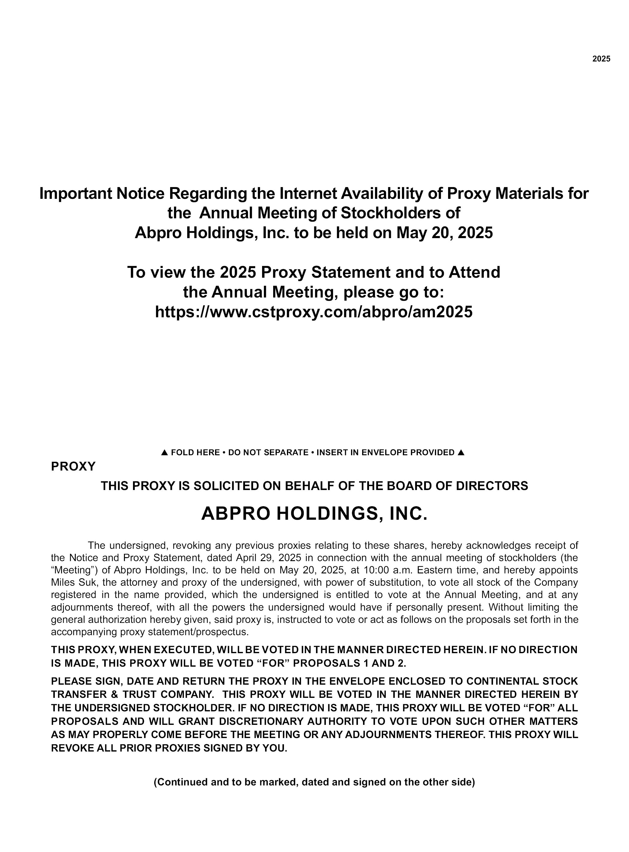 2025 Important Notice Regarding the Internet Availability of Proxy Materials for the Annual Meeting of Stockholders of Abpro Holdings, Inc. to be held on May 20, 2025 To view the 2025 Proxy Statement and to Attend the Annual Meeting, please go to: https://www.cstproxy.com/abpro/am2025 FOLD HERE DO NOT SEPARATE INSERT IN ENVELOPE PROVIDED PROXY THIS PROXY IS SOLICITED ON BEHALF OF THE BOARD OF DIRECTORS ABPRO HOLDINGS, INC. The undersigned, revoking any previous proxies relating to these shares, hereby acknowledges receipt of the Notice and Proxy Statement, dated April 29, 2025 in connection with the annual meeting of stockholders (the “Meeting”) of Abpro Holdings, Inc. to be held on May 20, 2025, at 10:00 a.m. Eastern time, and hereby appoints Miles Suk, the attorney and proxy of the undersigned, with power of substitution, to vote all stock of the Company registered in the name provided, which the undersigned is entitled to vote at the Annual Meeting, and at any adjournments thereof, with all the powers the undersigned would have if personally present. Without limiting the general authorization hereby given, said proxy is, instructed to vote or act as follows on the proposals set forth in the accompanying proxy statement/prospectus. THIS PROXY, WHEN EXECUTED, WILL BE VOTED IN THE MANNER DIRECTED HEREIN. IF NO DIRECTION IS MADE, THIS PROXY WILL BE VOTED “FOR” PROPOSALS 1 AND 2. PLEASE SIGN, DATE AND RETURN THE PROXY IN THE ENVELOPE ENCLOSED TO CONTINENTAL STOCK TRANSFER & TRUST COMPANY. THIS PROXY WILL BE VOTED IN THE MANNER DIRECTED HEREIN BY THE UNDERSIGNED STOCKHOLDER. IF NO DIRECTION IS MADE, THIS PROXY WILL BE VOTED “FOR” ALL PROPOSALS AND WILL GRANT DISCRETIONARY AUTHORITY TO VOTE UPON SUCH OTHER MATTERS AS MAY PROPERLY COME BEFORE THE MEETING OR ANY ADJOURNMENTS THEREOF. THIS PROXY WILL REVOKE ALL PRIOR PROXIES SIGNED BY YOU. (Continued and to be marked, dated and signed on the other side)