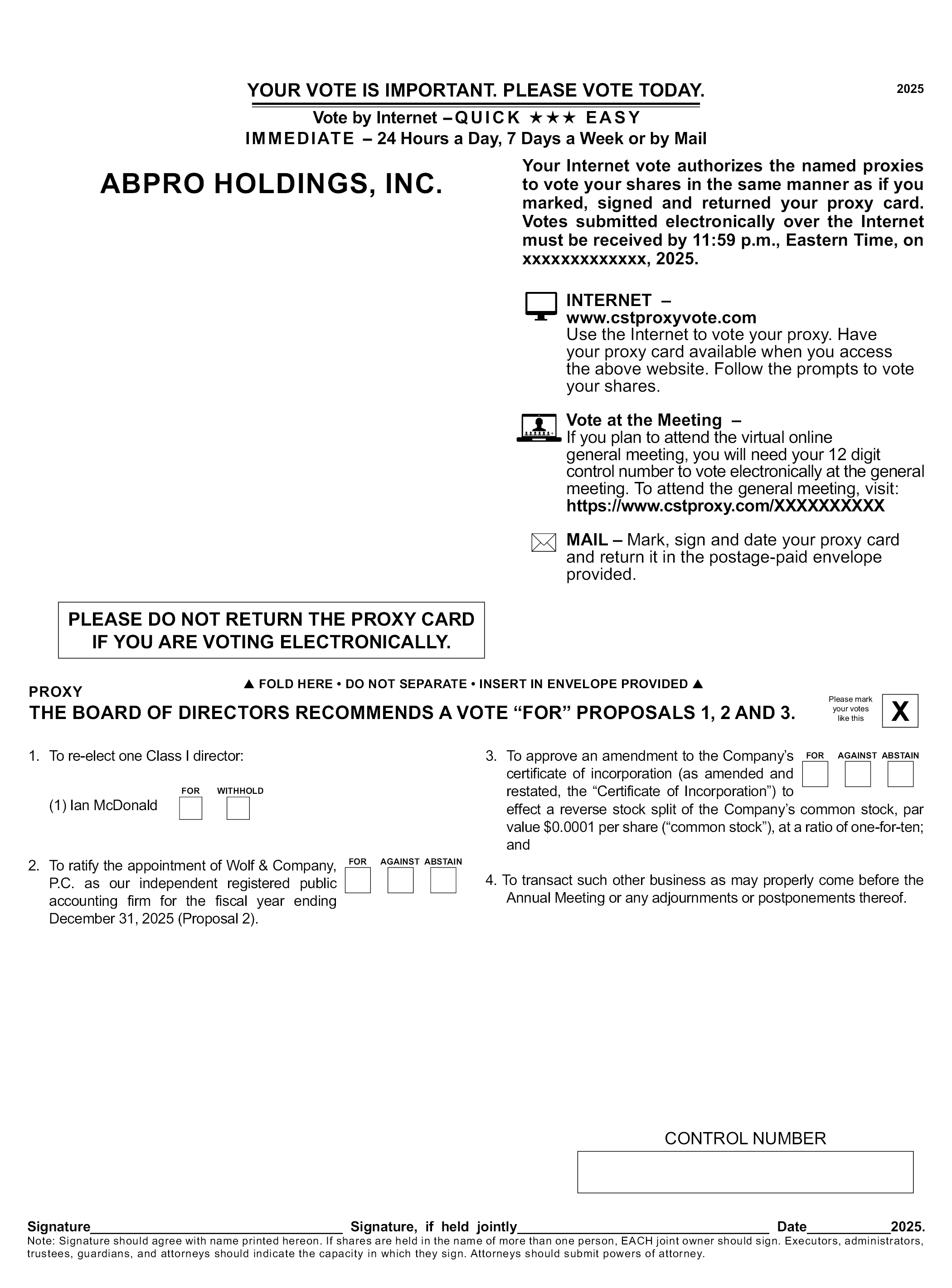 YOUR VOTE IS IMPORTANT. PLEASE VOTE TODAY. 2025 Vote by Internet - QUICK EASY IMMEDIATE - 24 Hours a Day, 7 Days a Week or by Mail ABPRO HOLDINGS, INC. Your Internet vote authorizes the named proxies to vote your shares in the same manner as if you marked, signed and returned your proxy card. Votes submitted electronically over the Internet must be received by 11:59 p.m., Eastern Time, on xxxxxxxxxxxxx, 2025. INTERNET – www.cstproxyvote.com Use the Internet to vote your proxy. Have your proxy card available when you access the above website. Follow the prompts to vote your shares. Vote at the Meeting – If you plan to attend the virtual online general meeting, you will need your 12 digit control number to vote electronically at the general meeting. To attend the general meeting, visit: https://www.cstproxy.com/XXXXXXXXXX MAIL – Mark, sign and date your proxy card and return it in the postage-paid envelope provided. PLEASE DO NOT RETURN THE PROXY CARD IF YOU ARE VOTING ELECTRONICALLY. FOLD HERE DO NOT SEPARATE INSERT IN ENVELOPE PROVIDED PROXY THE BOARD OF DIRECTORS RECOMMENDS A VOTE “FOR” PROPOSALS 1, 2 AND 3. Please mark your votes like this 1. To re-elect one Class I director: (1) Ian McDonald FOR WITHHOLD 2. To ratify the appointment of Wolf & Company, P.C. as our independent registered public accounting firm for the fiscal year ending December 31, 2025 (Proposal 2). FOR AGAINST ABSTAIN 3. To approve an amendment to the Company’s certificate of incorporation (as amended and restated, the “Certificate of Incorporation”) to effect a reverse stock split of the Company’s common stock, par value $0.0001 per share (“common stock”), at a ratio of one-for-ten; and 4. To transact such other business as may properly come before the Annual Meeting or any adjournments or postponements thereof. CONTROL NUMBER Signature Signature, if held jointly Date2025. Note: Signature should agree with name printed hereon. If shares are held in the name of more than one person, EACH joint owner should sign. Executors, administrators, trustees, guardians, and attorneys should indicate the capacity in which they sign. Attorneys should submit powers of attorney.