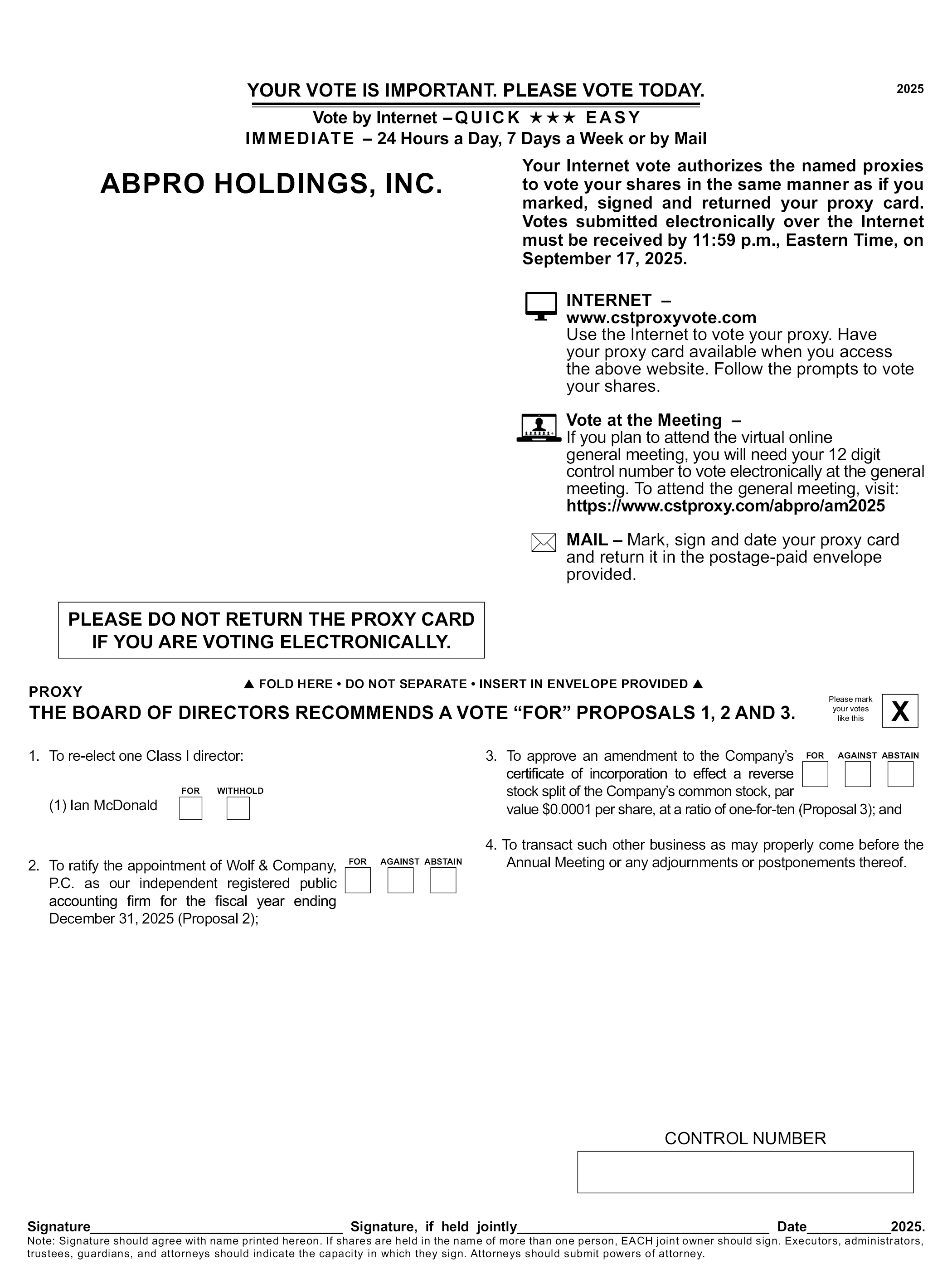2025 YOUR VOTE IS IMPORTANT. PLEASE VOTE TODAY. IMMEDIATE - 24 Hours a Day, 7 Days a Week or by Mail Vote by Internet - QUICK EASY ABPRO HOLDINGS, INC. INTERNET – www.cstproxyvote.com Use the Internet to vote your proxy. Have your proxy card available when you access the above website. Follow the prompts to vote your shares. Vote at the Meeting – If you plan to attend the virtual online general meeting, you will need your 12 digit control number to vote electronically at the general meeting. To attend the general meeting, visit: https://www.cstproxy.com/abpro/am2025 MAIL – Mark, sign and date your proxy card and return it in the postage-paid envelope provided. Your Internet vote authorizes the named proxies to vote your shares in the same manner as if you marked, signed and returned your proxy card. Votes submitted electronically over the Internet must be received by 11:59 p.m., Eastern Time, on September 17, 2025. 2025 PLEASE DO NOT RETURN THE PROXY CARD IF YOU ARE VOTING ELECTRONICALLY. FOLD HERE • DO NOT SEPARATE • INSERT IN ENVELOPE PROVIDED PROXY 3. To approve an amendment to the Company’s certificate of incorporation to effect a reverse stock split of the Company’s common stock, par value $0.0001 per share, at a ratio of one-for-ten (Proposal 3;) and 4. To transact such other business as may properly come before the Annual Meeting or any adjournments or postponements thereof. 1. To re-elect one Class I director: (1) Ian McDonald 2. To ratify the appointment of Wolf & Company, P.C. as our independent registered public accounting firm for the fiscal year ending December 31, 2025 (Proposal 2); Please mark your votes like this X PROXY THE BOARD OF DIRECTORS RECOMMENDS A VOTE “FOR” PROPOSALS 1, 2 AND 3. FOR WITHHOLD FOR AGAINST ABSTAIN FOR AGAINST ABSTAIN Signature Signature, if held jointly Date 2025. Note: Signature should agree with name printed hereon. If shares are held in the name of more than one person, EACH joint owner should sign. Executors, administrators, trustees, guardians, and attorneys should indicate the capacity in which they sign. Attorneys should submit powers of attorney .