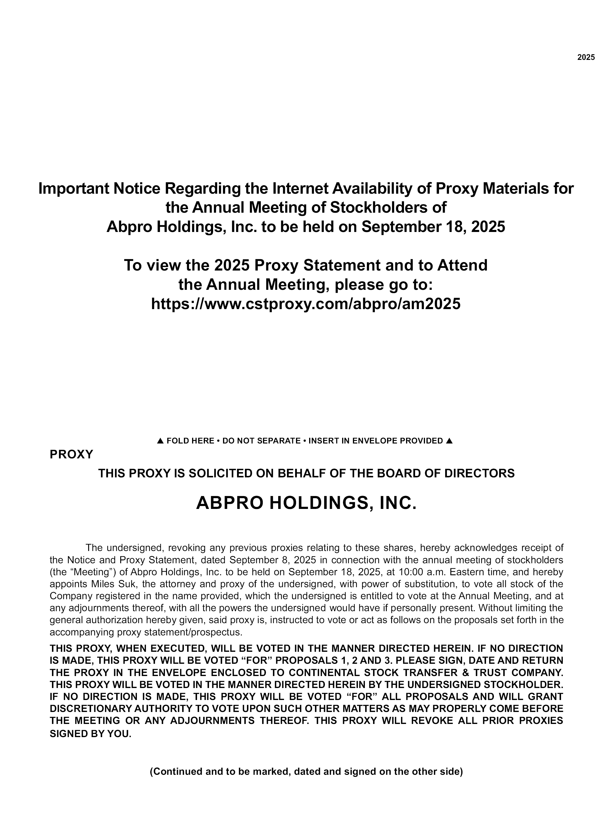2025 Important Notice Regarding the Internet Availability of Proxy Materials for the Annual Meeting of Stockholders of Abpro Holdings, Inc. to be held on September 18, 2025 To view the 2025 Proxy Statement and to Attend the Annual Meeting, please go to: https://www.cstproxy.com/abpro/am2025 FOLD HERE DO NOT SEPARATE • INSERT IN ENVELOPE PROVIDED PROXY THIS PROXY IS SOLICITED ON BEHALF OF THE BOARD OF DIRECTORS ABPRO HOLDINGS, INC. The undersigned, revoking any previous proxies relating to these shares, hereby acknowledges receipt of the Notice and Proxy Statement, dated September 8, 2025 in connection with the annual meeting of stockholders (the “Meeting”) of Abpro Holdings, Inc. to be held on September 18, 2025, at 10:00 a.m. Eastern time, and hereby appoints Miles Suk, the attorney and proxy of the undersigned, with power of substitution, to vote all stock of the Company registered in the name provided, which the undersigned is entitled to vote at the Annual Meeting, and at any adjournments thereof, with all the powers the undersigned would have if personally present. Without limiting the general authorization hereby given, said proxy is, instructed to vote or act as follows on the proposals set forth in the accompanying proxy statement/prospectus. THIS PROXY, WHEN EXECUTED, WILL BE VOTED IN THE MANNER DIRECTED HEREIN. IF NO DIRECTION IS MADE, THIS PROXY WILL BE VOTED “FOR” PROPOSALS 1, 2 AND 3. PLEASE SIGN, DATE AND RETURN THE PROXY IN THE ENVELOPE ENCLOSED TO CONTINENTAL STOCK TRANSFER & TRUST COMPANY. THIS PROXY WILL BE VOTED IN THE MANNER DIRECTED HEREIN BY THE UNDERSIGNED STOCKHOLDER. IF NO DIRECTION IS MADE, THIS PROXY WILL BE VOTED “FOR” ALL PROPOSALS AND WILL GRANT DISCRETIONARY AUTHORITY TO VOTE UPON SUCH OTHER MATTERS AS MAY PROPERLY COME BEFORE THE MEETING OR ANY ADJOURNMENTS THEREOF. THIS PROXY WILL REVOKE ALL PRIOR PROXIES SIGNED BY YOU. (Continued and to be marked, dated and signed on the other side)