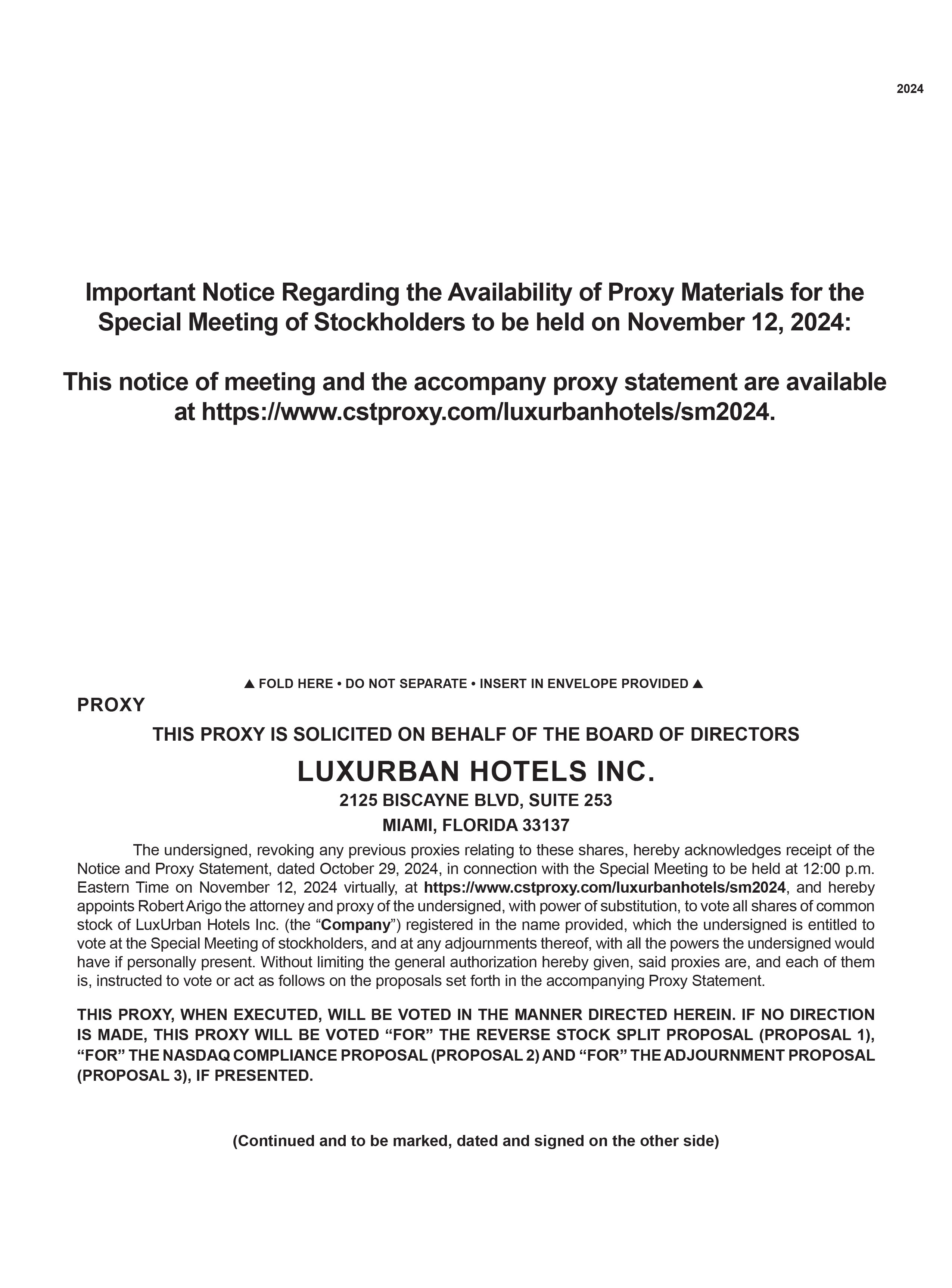 Important Notice Regarding the Availability of Proxy Materials for the Special Meeting of Stockholders to be held on November 12, 2024:This notice of meeting and the accompany proxy statement are available at https://www.cstproxy.com/luxurbanhotels/sm2024.FOLD HERE • DO NOT SEPARATE • INSERT IN ENVELOPE PROVIDEDPROXYTHIS PROXY IS SOLICITED ON BEHALF OF THE BOARD OF DIRECTORSLUXURBAN HOTELS INC.2125 BISCAYNE BLVD, SUITE 253MIAMI, FLORIDA 33137The undersigned, revoking any previous proxies relating to these shares, hereby acknowledges receipt of theNotice and Proxy Statement, dated October [__], 2024, in connection with the Special Meeting to be held at 12:00 p.m. Eastern Time on November 12, 2024 virtually, at https://www.cstproxy.com/luxurbanhotels/sm2024, and hereby appoints Robert Arigo the attorney and proxy of the undersigned, with power of substitution, to vote all shares of common stock of LuxUrban Hotels Inc. (the “Company”) registered in the name provided, which the undersigned is entitled to vote at the Special Meeting of stockholders, and at any adjournments thereof, with all the powers the undersigned would have if personally present. Without limiting the general authorization hereby given, said proxies are, and each of them is, instructed to vote or act as follows on the proposals set forth in the accompanying Proxy Statement.THIS PROXY, WHEN EXECUTED, WILL BE VOTED IN THE MANNER DIRECTED HEREIN. IF NO DIRECTION IS MADE, THIS PROXY WILL BE VOTED “FOR” THE REVERSE STOCK SPLIT PROPOSAL (PROPOSAL 1), “FOR” THE NASDAQ COMPLIANCE PROPOSAL (PROPOSAL 2) AND “FOR” THE ADJOURNMENT PROPOSAL (PROPOSAL 3), IF PRESENTED (Continued and to be marked, dated and signed on the other side)