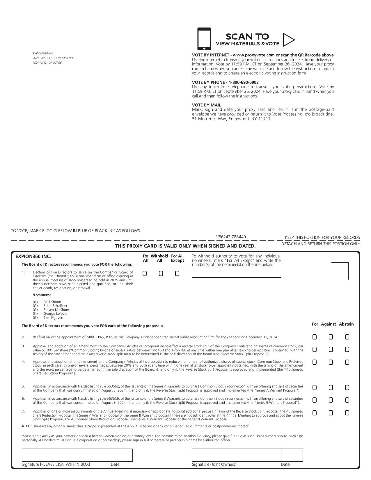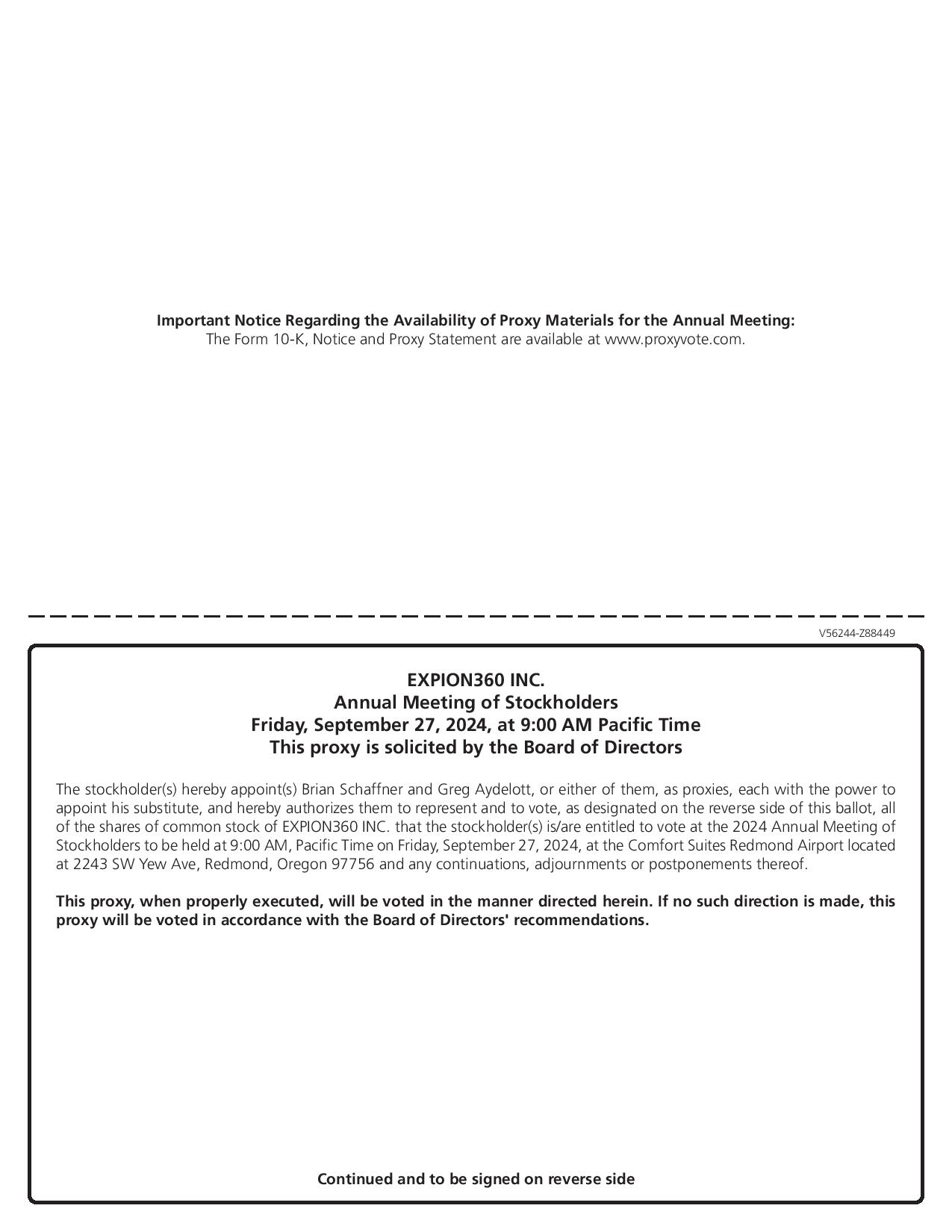 NOTICE IS HEREBY GIVEN that the 2024 Annual Meeting of Stockholders (the “Annual Meeting”) of Expion360 Inc., a Nevada corporation (the “Company,” “us,” or “ours”), will be held on Friday, September 27, 2024, at 9:00 a.m., Pacific Time, at the Comfort Suites Redmond Airport located at 2243 SW Yew Ave, Redmond, Oregon 97756, for the following purposes: