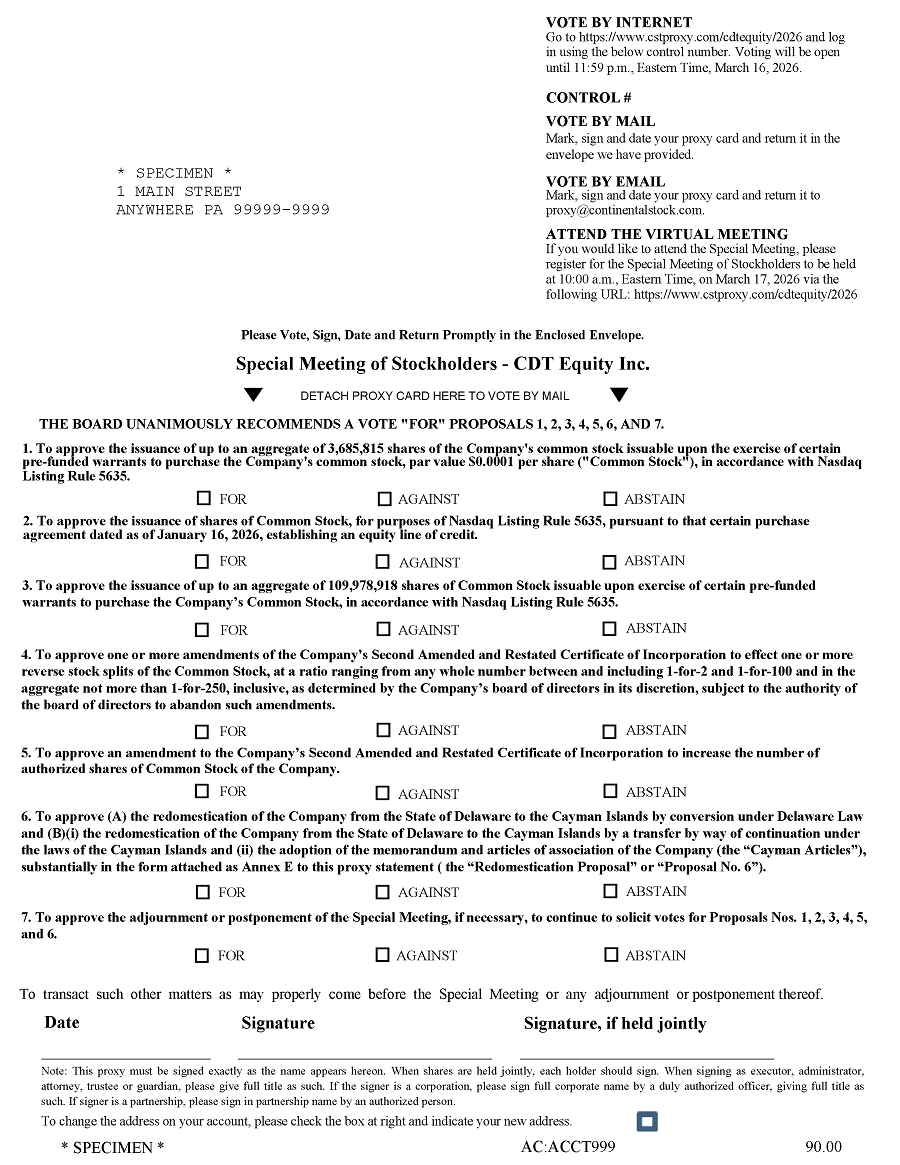 The 2026 virtual special meeting of stockholders (the “Special Meeting”) of CDT Equity Inc., a Delaware corporation, will be held on Tuesday, March 17, 2026, at 10:00 a.m., Eastern Time, for the following purpose: