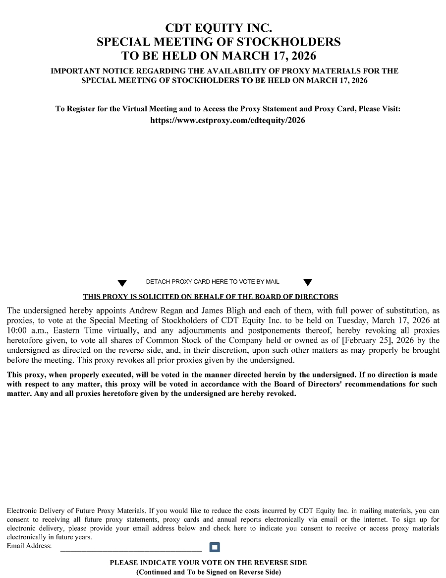 CDT Equity Inc. is furnishing this proxy statement to our stockholders of record as of the close of business on [February 25], 2026 (the “Record Date”) in connection with our solicitation of proxies for use at the virtual special meeting of stockholders to be held on Tuesday, March 17, 2026 at 10:00 a.m., Eastern Time and any adjournment(s), postponement(s) or other delays thereof (the “Special Meeting”).