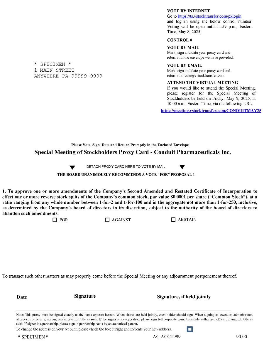 The 2025 virtual special meeting of stockholders (the “Special Meeting”) of Conduit Pharmaceuticals Inc., a Delaware corporation, will be held on Friday, May 9, 2025, at 10:00 a.m., Eastern Time, for the following purposes: