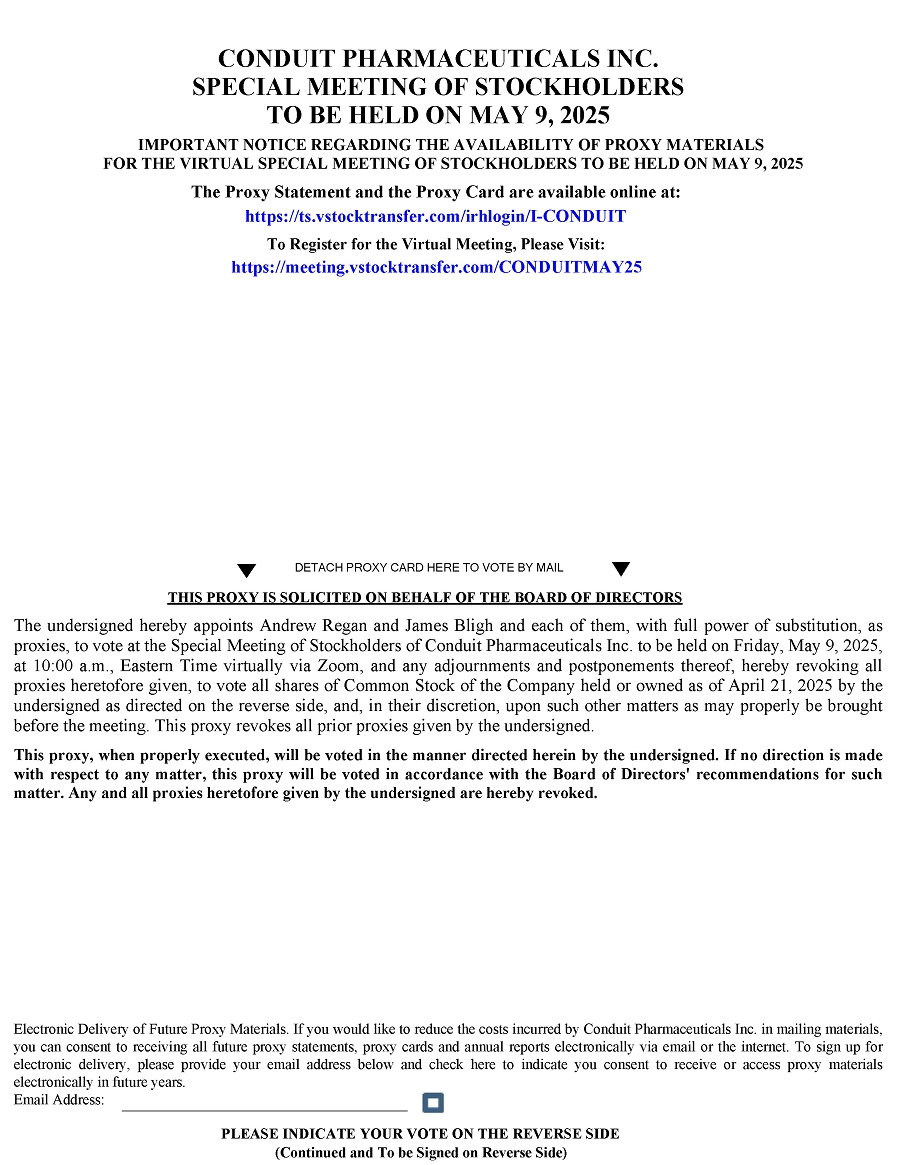 Conduit Pharmaceuticals Inc. is furnishing this proxy statement to our stockholders of record as of the close of business on April 21, 2025 (the “Record Date”) in connection with our solicitation of proxies for use at the virtual special meeting of stockholders to be held on Friday, May 9, 2025 at 10:00 a.m., Eastern Time and any adjournment(s), postponement(s) or other delays thereof (the “Special Meeting”).