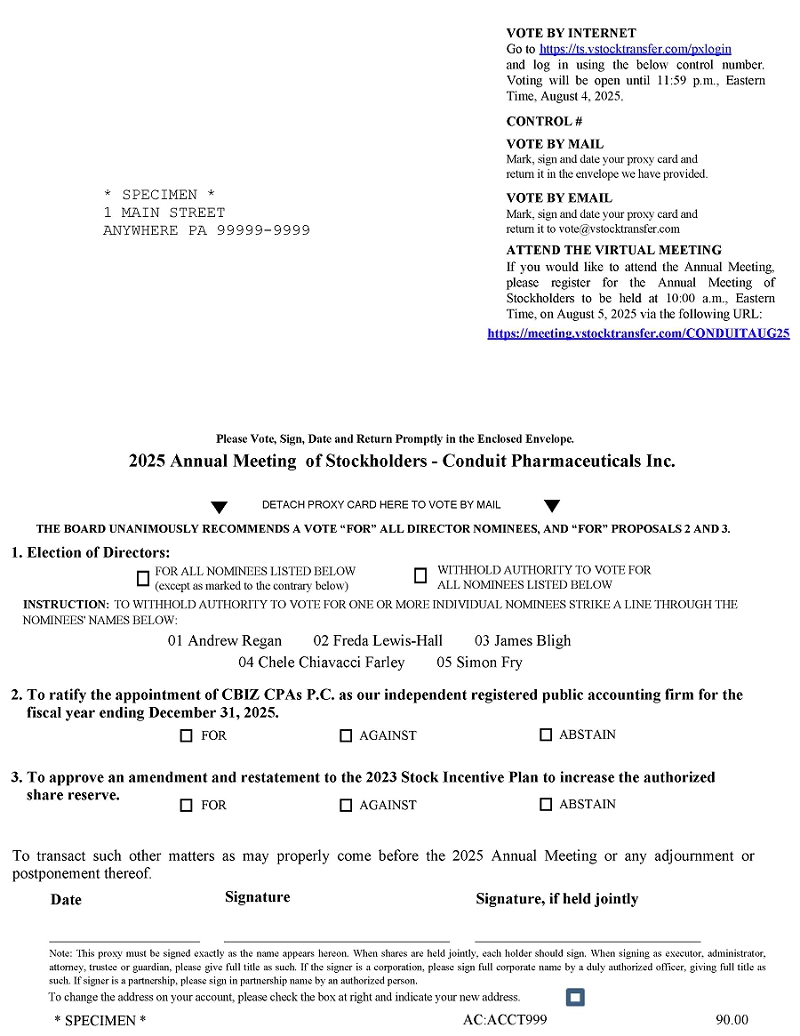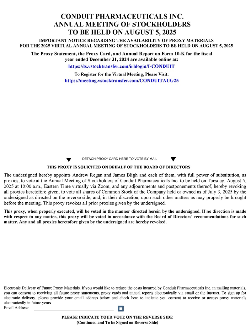 The 2025 virtual annual meeting of stockholders (the “2025 Annual Meeting”) of Conduit Pharmaceuticals Inc., a Delaware corporation, will be held on Tuesday, August 5, 2025, at 10:00 a.m., Eastern Time, for the following purposes:
