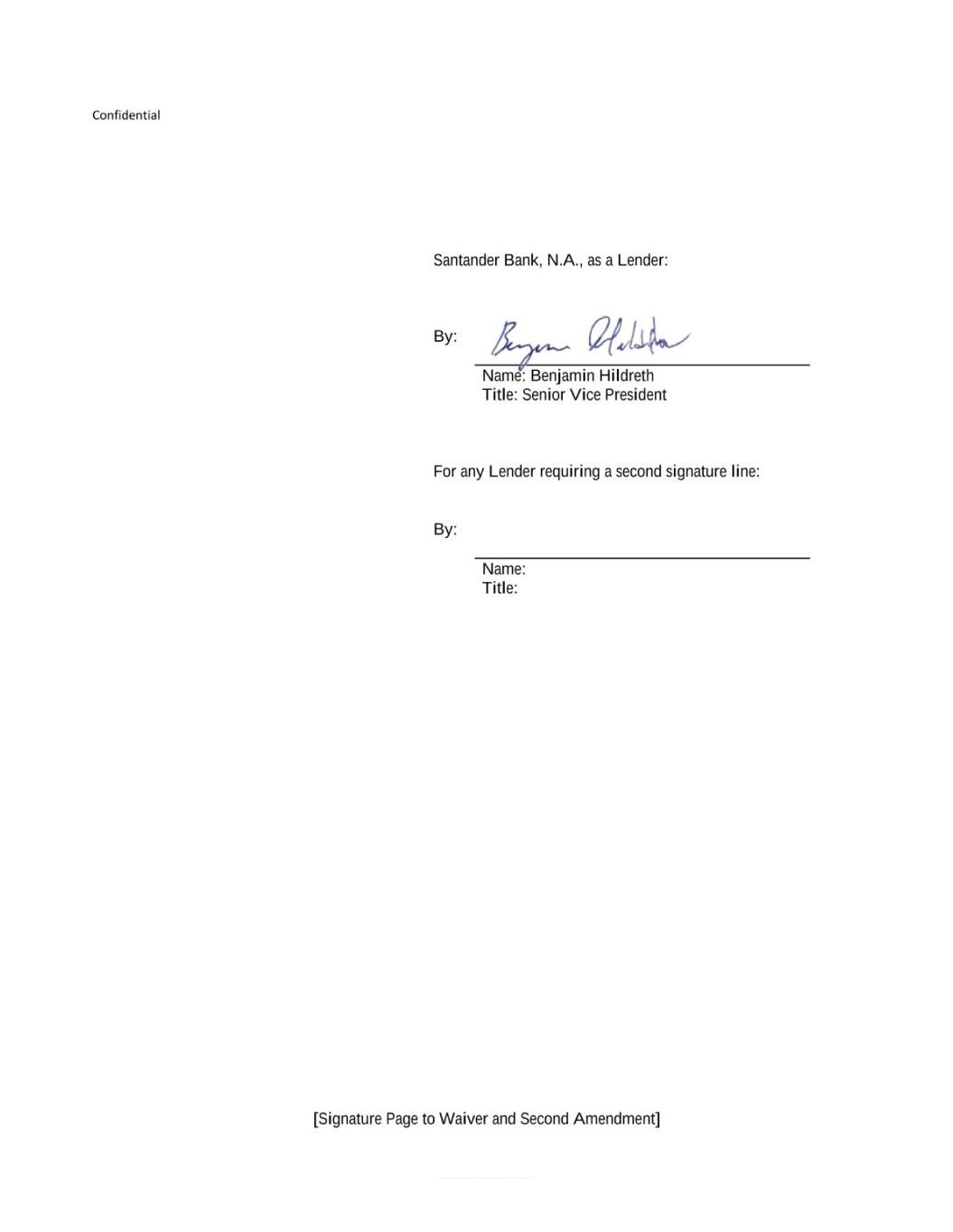 [Signature Page to Waiver and Second Amendment] Confidential Santander Bank, N.A., as a Lender: By: Name: Benjamin Hildreth Title: Senior Vice President For any Lender requiring a second signature line: By: Name: Title: