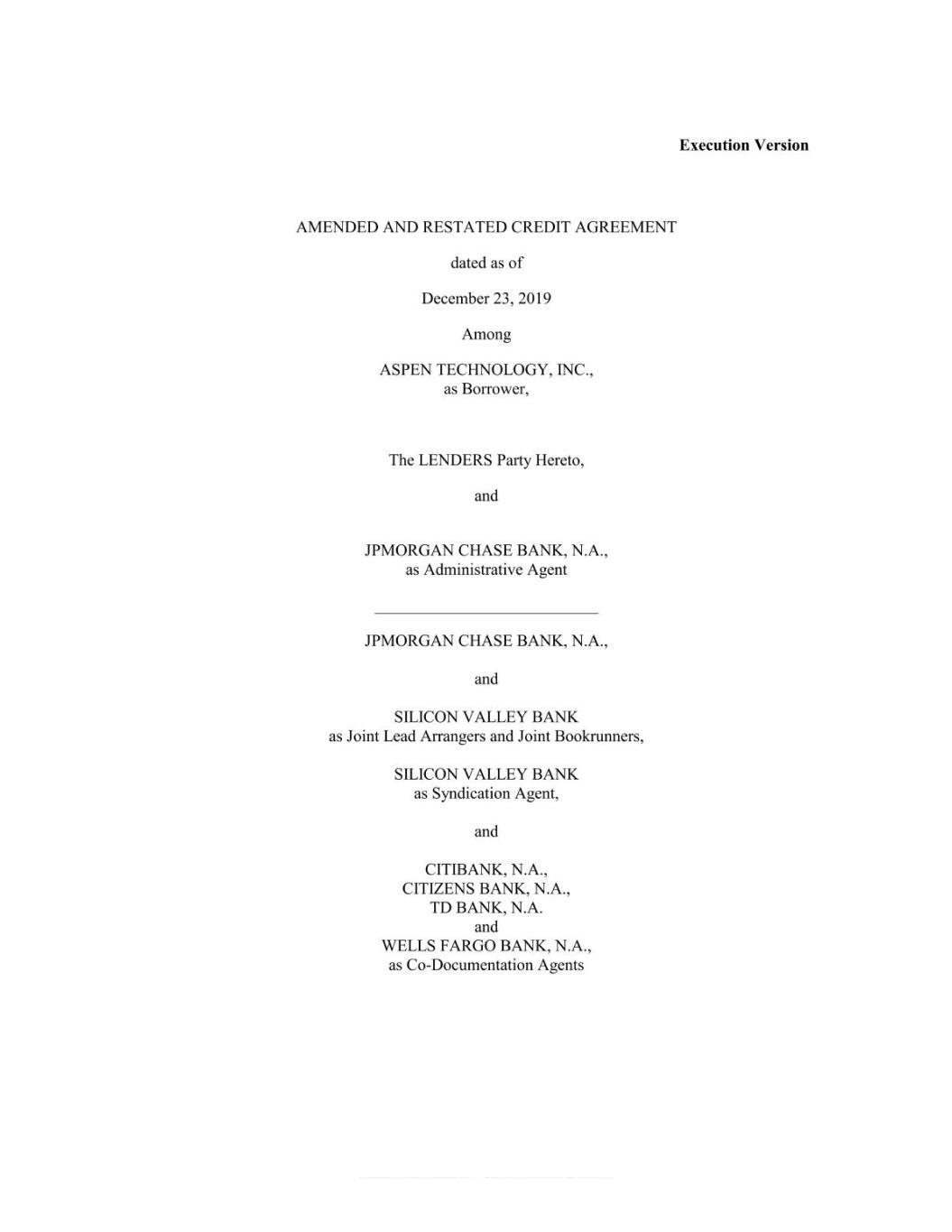 Execution Version AMENDED AND RESTATED CREDIT AGREEMENT dated as of December 23, 2019 Among ASPEN TECHNOLOGY, INC., as Borrower, The LENDERS Party Hereto, and JPMORGAN CHASE BANK, N.A., as Administrative Agent ___________________________ JPMORGAN CHASE BANK, N.A., and SILICON VALLEY BANK as Joint Lead Arrangers and Joint Bookrunners, SILICON VALLEY BANK as Syndication Agent, and CITIBANK, N.A., CITIZENS BANK, N.A., TD BANK, N.A. and WELLS FARGO BANK, N.A., as Co-Documentation Agents